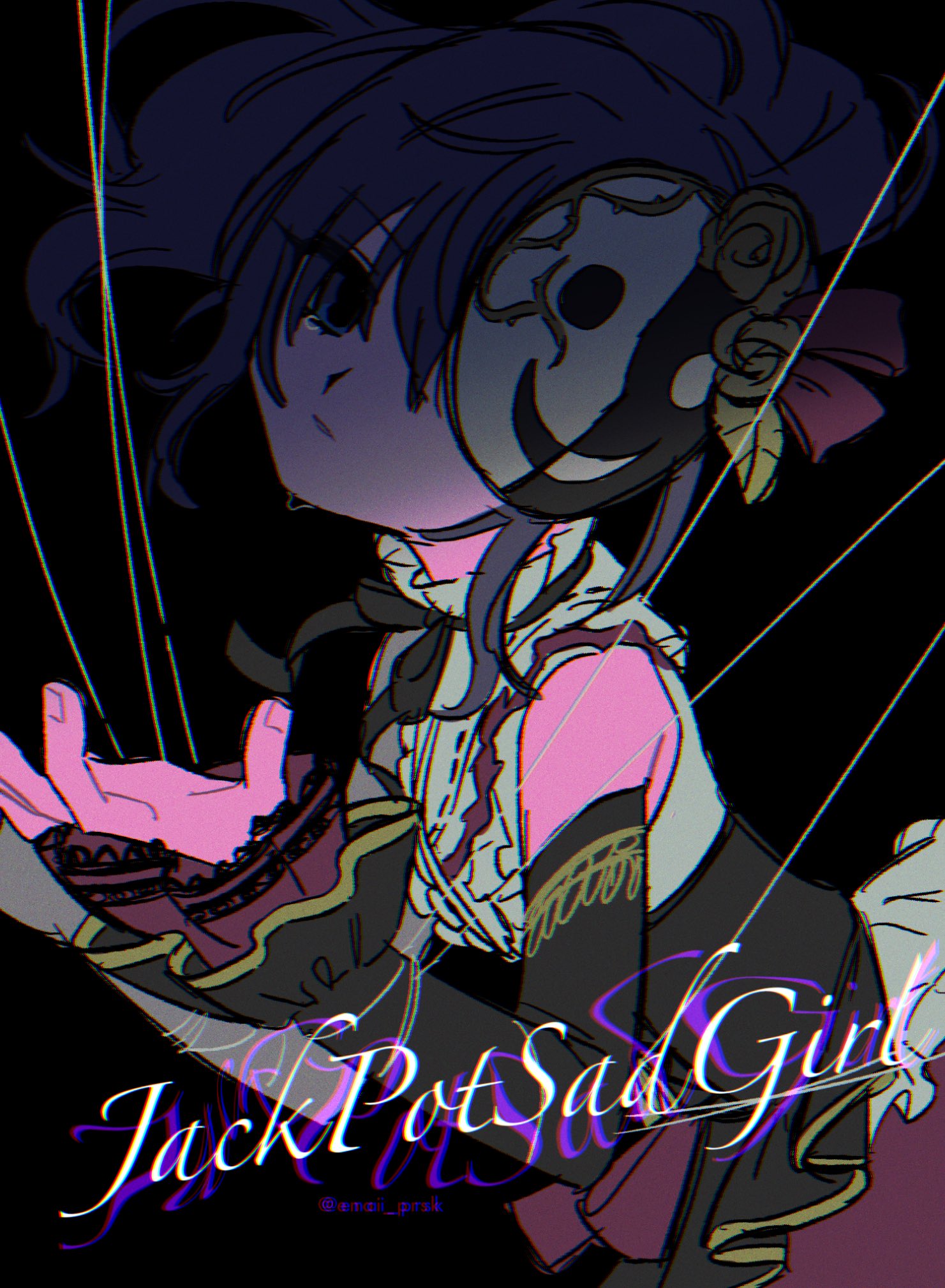 1girlbare shouldersblack backgroundblack corsetblack ribbonbowbrown skirtcenter frillschromatic aberrationcorsetdetached sleevesempty eyesfilm grainfingernailsflowerfrilled sleevesfrillsfrom abovehair between eyeshair bowhand uphands uphigh ponytaillong hairlong sleeveslooking at viewerlooking upmaskneck ribbonone eye coveredparted lipsponytailpuppet stringspurple eyespurple hairred bowribbonroseshirtsimple backgroundskirtsleevelesssleeveless shirtsleeves past wristssolotearing uptwitter usernameupper bodywhite shirtyellow floweryellow rose