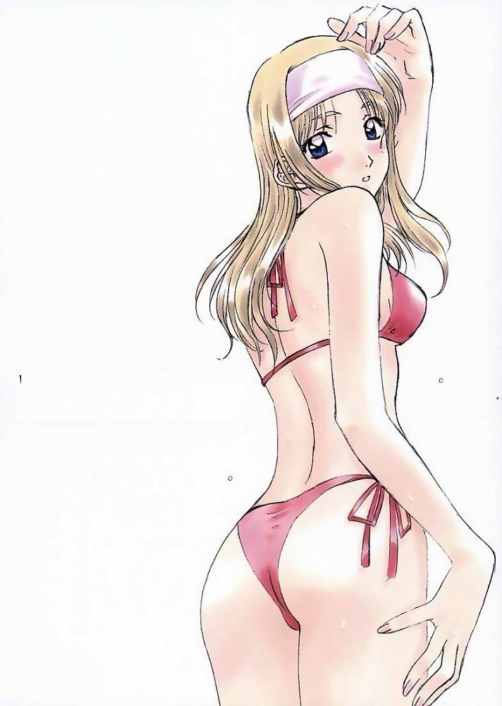 imo cyber, imomi, traditional media, unfinished, 1girl, armband, bikini, blonde hair, convenient censoring, female focus, flat chest, flippers, full body, grin, hair censor, hair over breasts, jewelry, loli, long hair, long legs, navel, necklace, polearm, smile, solo, spear, standing, swimsuit, tan, topless female, trident, underwear, weapon, white background