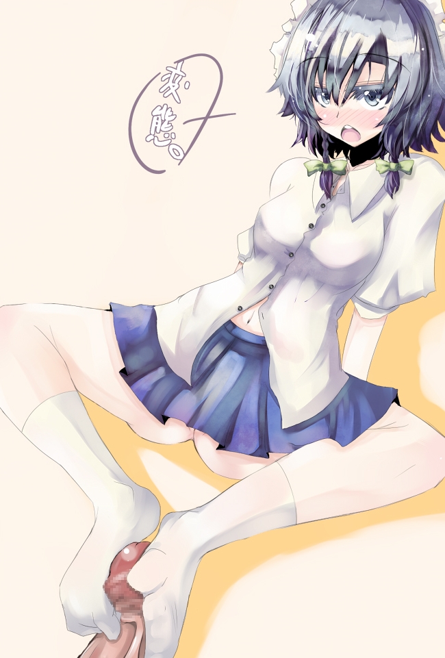 1girlblushbraidcensoredfeetfootjobfootjob with legwearmosaic censoringno pantiesopen mouthpenisribbonshort hairsockssolo focustwin braids