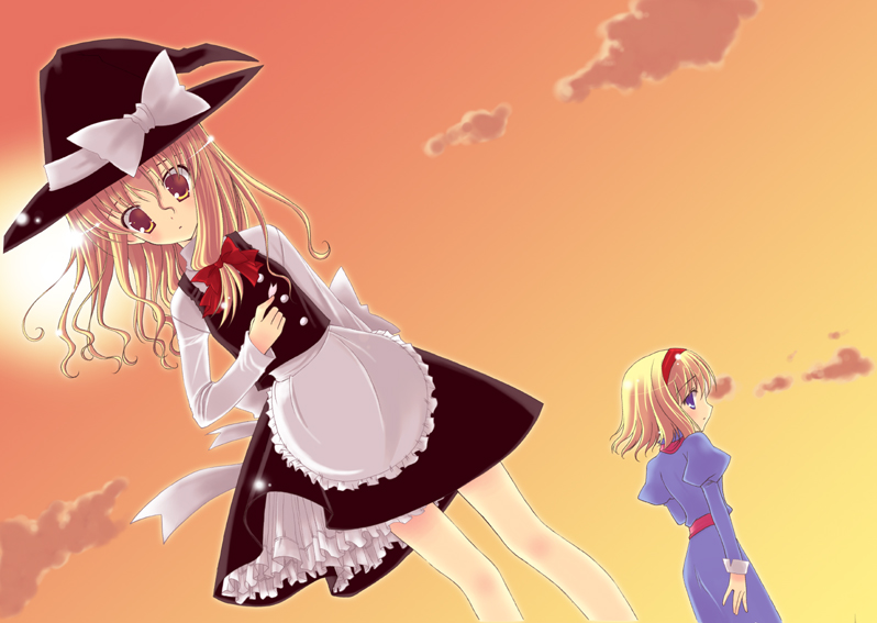 2girlsapronbacklightingblonde hairblue eyesbowbraidcloudcovercover pagedutch anglefemale focushair ribbonhairbandhathat bowjuliet sleeveslong hairlong sleeveslooking backmultiple girlspetalspuffy sleevesribbonshort hairside braidskirtskirt setskysunsunlighttress ribbontwilightwitchwitch hatyellow eyes