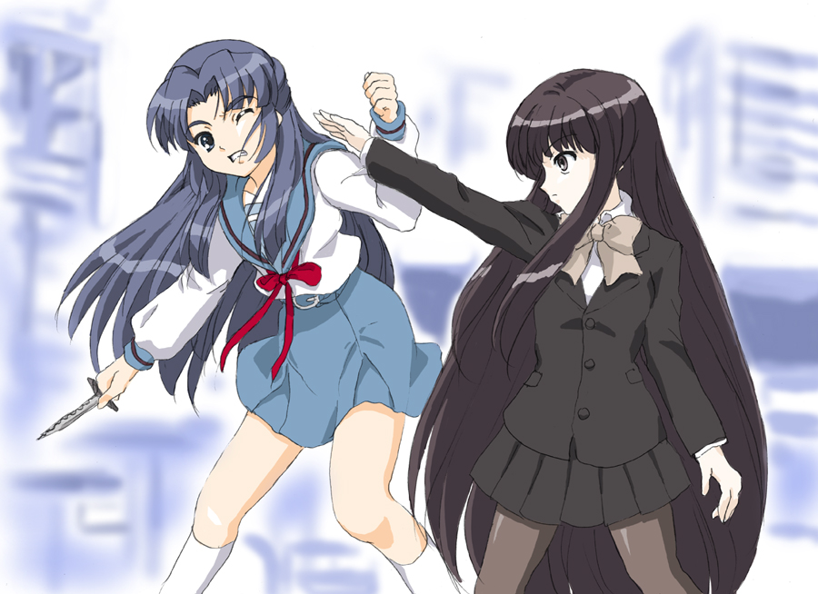 00s2girlsbattleblack hairblue eyesblue hairfemale focusknifekouyouen academy school uniformlong hairmultiple girlsoutdoorspantyhoseschool uniformserafukustandingvery long hair