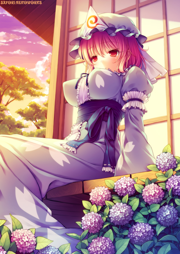 1boy1girlbreastscovered erect nipplesfemale focusflowerhathydrangealarge breastspink hairred eyesshort hairsittingsolo