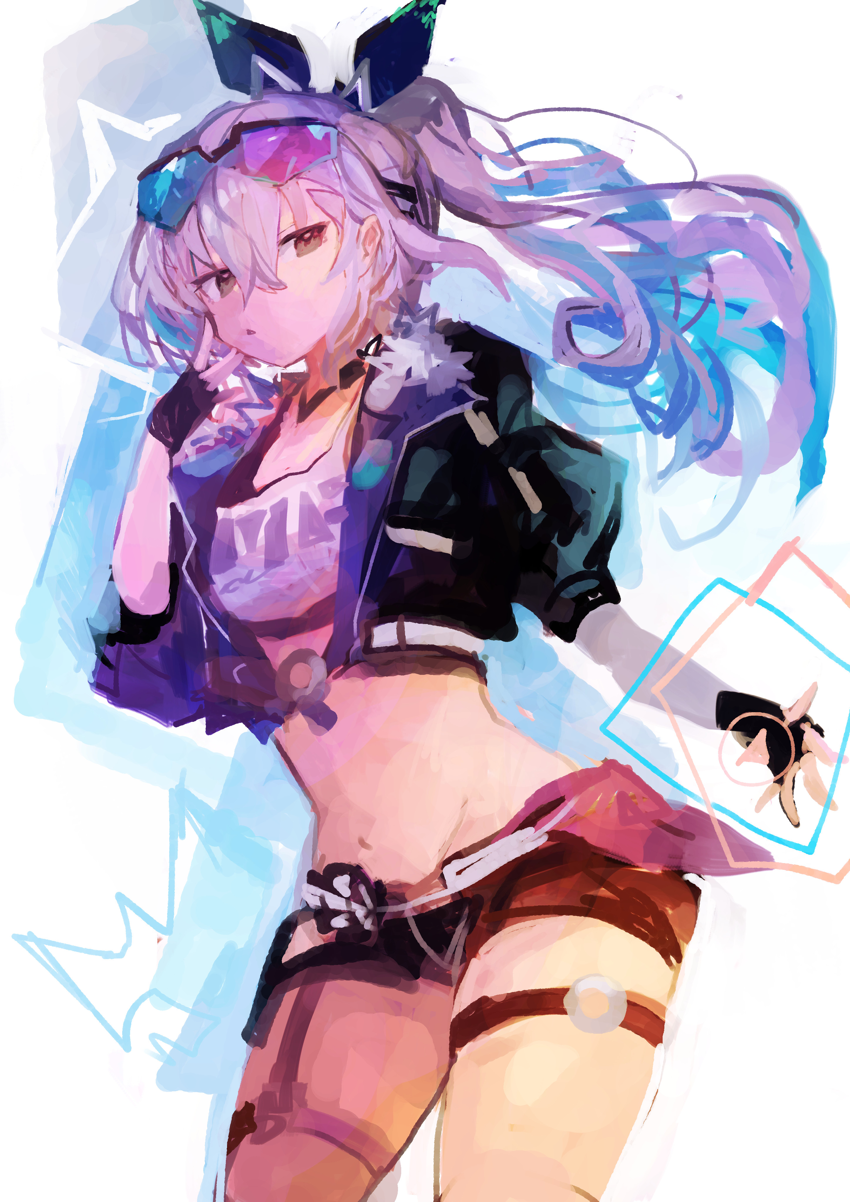 1girlblack glovesblack jacketblack ribbonblue haircrop topcropped jacketfingerless glovesfur trimfur-trimmed jacketglovesgogglesgoggles on headgrey hairhair ribbonjacketlong hairmicro shortsmidriffmulticolored hairponytailpurple hairribbonshirtshort shortsshortssolostomachthigh strap