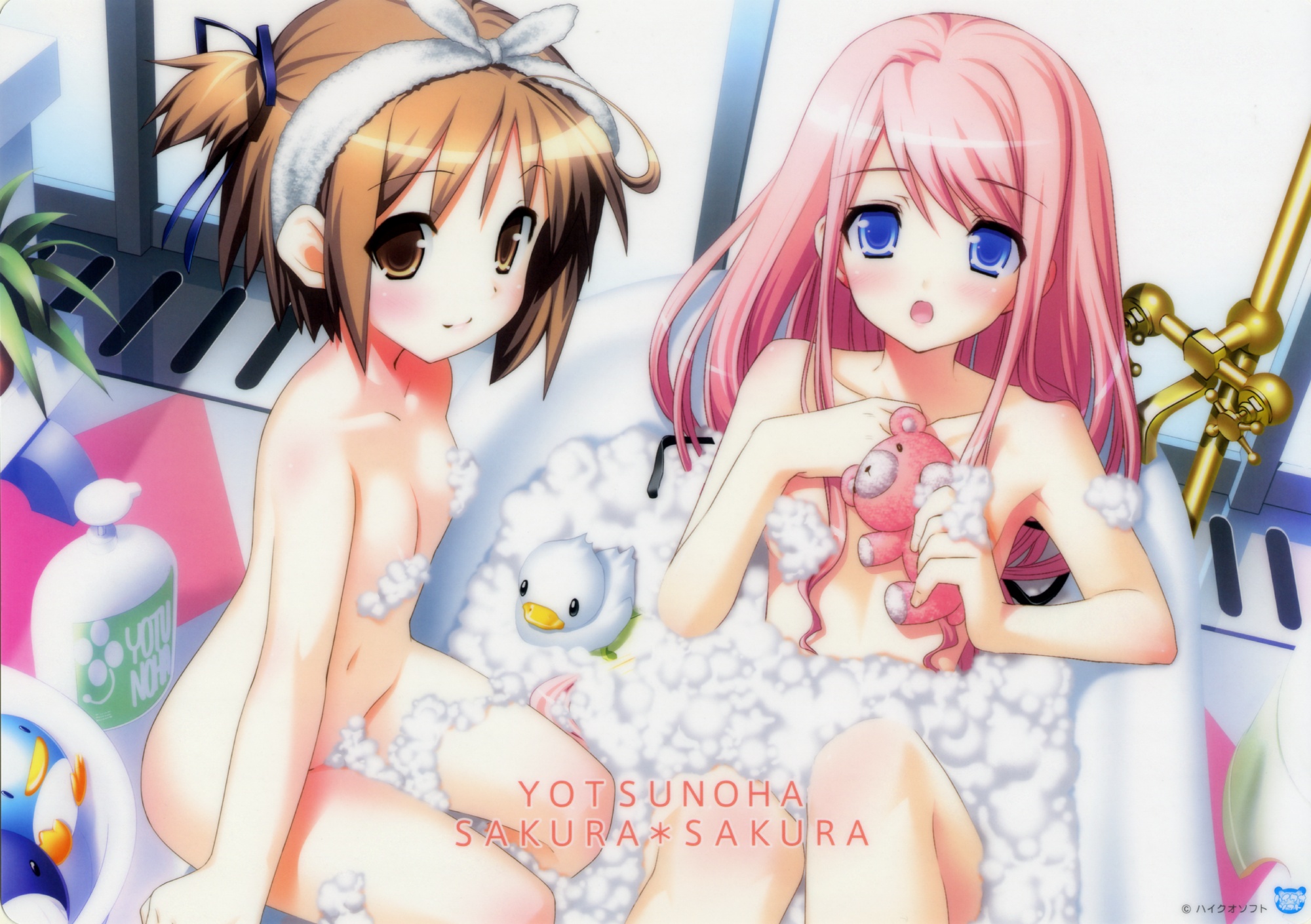 2girlsbathblue eyesbrown eyesbrown haircrossoverflat chestlong hairmultiple girlsnudepink hairshort hair
