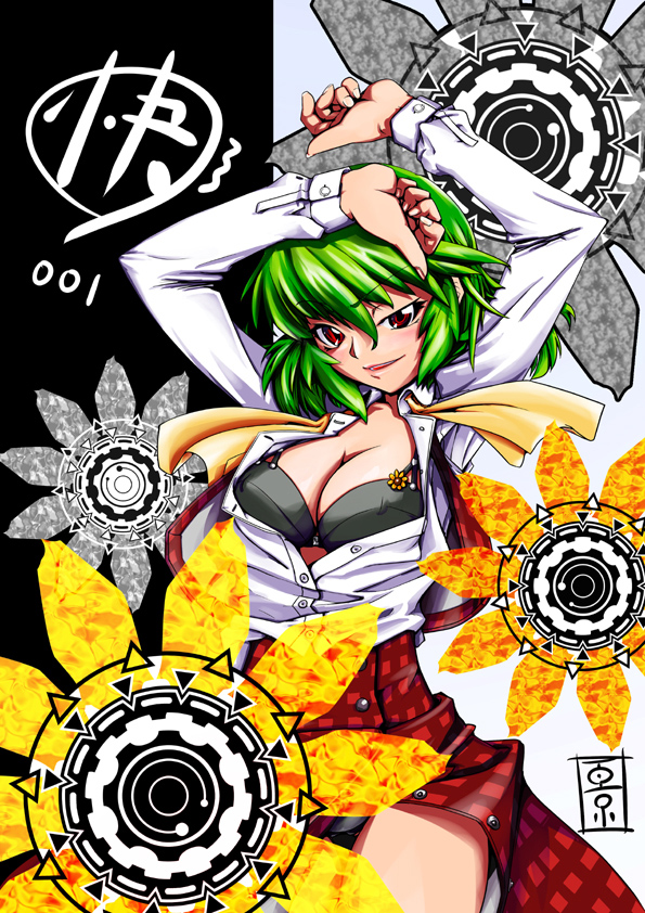 1girlarms upascotblack brablack pantiesbrabreastscleavagedress shirtfemale focusgreen hairlarge breastslingerieopen clothesopen shirtopen skirtpantiesplaid clothesplaid skirtplaid vestred eyesshirtshort hairskirtskirt setsmirksolounderwearvest