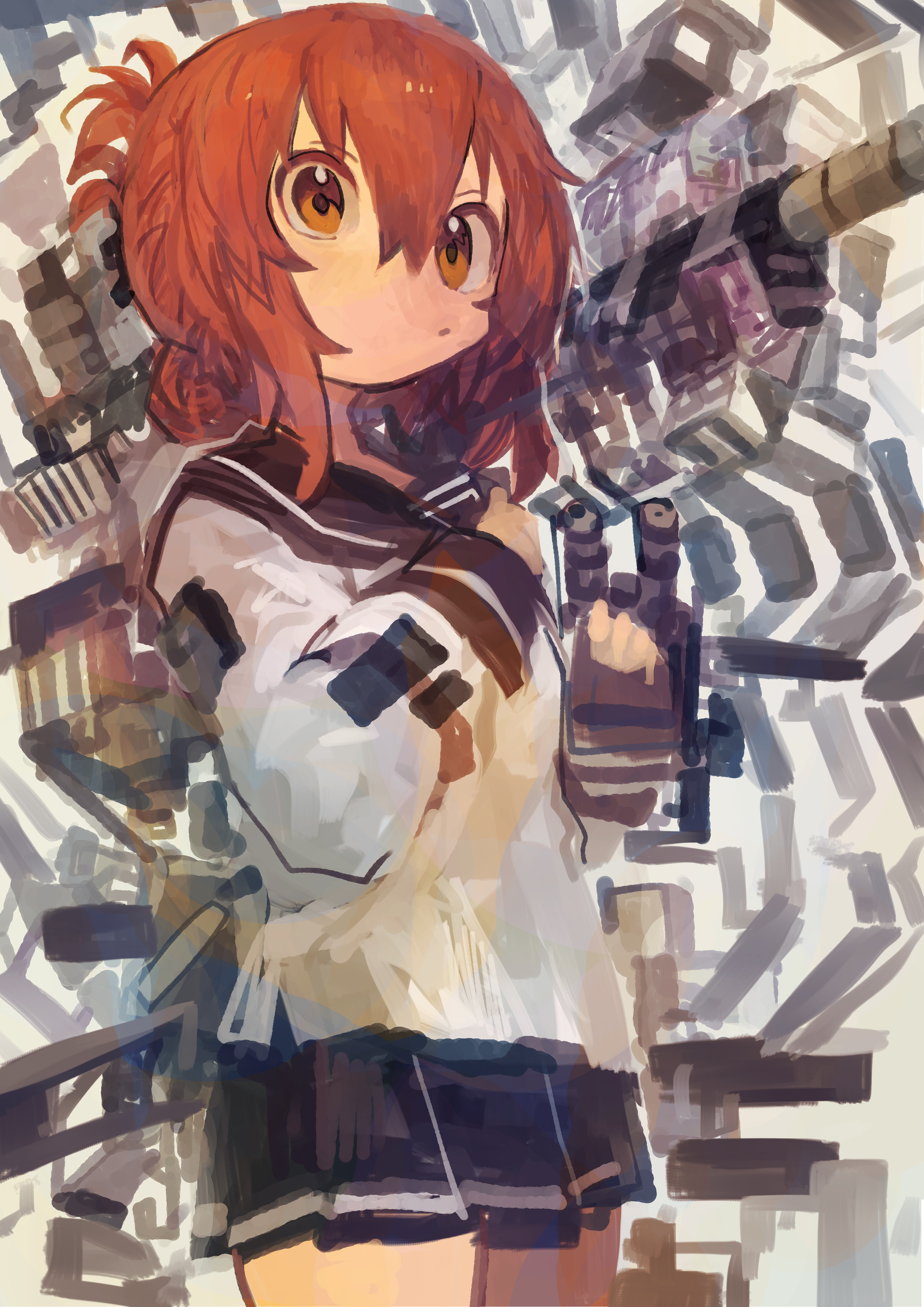 yuushou, yahagi (kancolle), yahagi kai ni (kancolle), kantai collection, absurdres, highres, 1girl, black hair, black sailor collar, black skirt, boots, breasts, brown eyes, hair between eyes, large breasts, long hair, pleated skirt, ponytail, red eyes, ribbon, sailor collar, school uniform, shirt, skirt, smile, solo, squatting, thighhighs, very long hair, white shirt, zoom layer