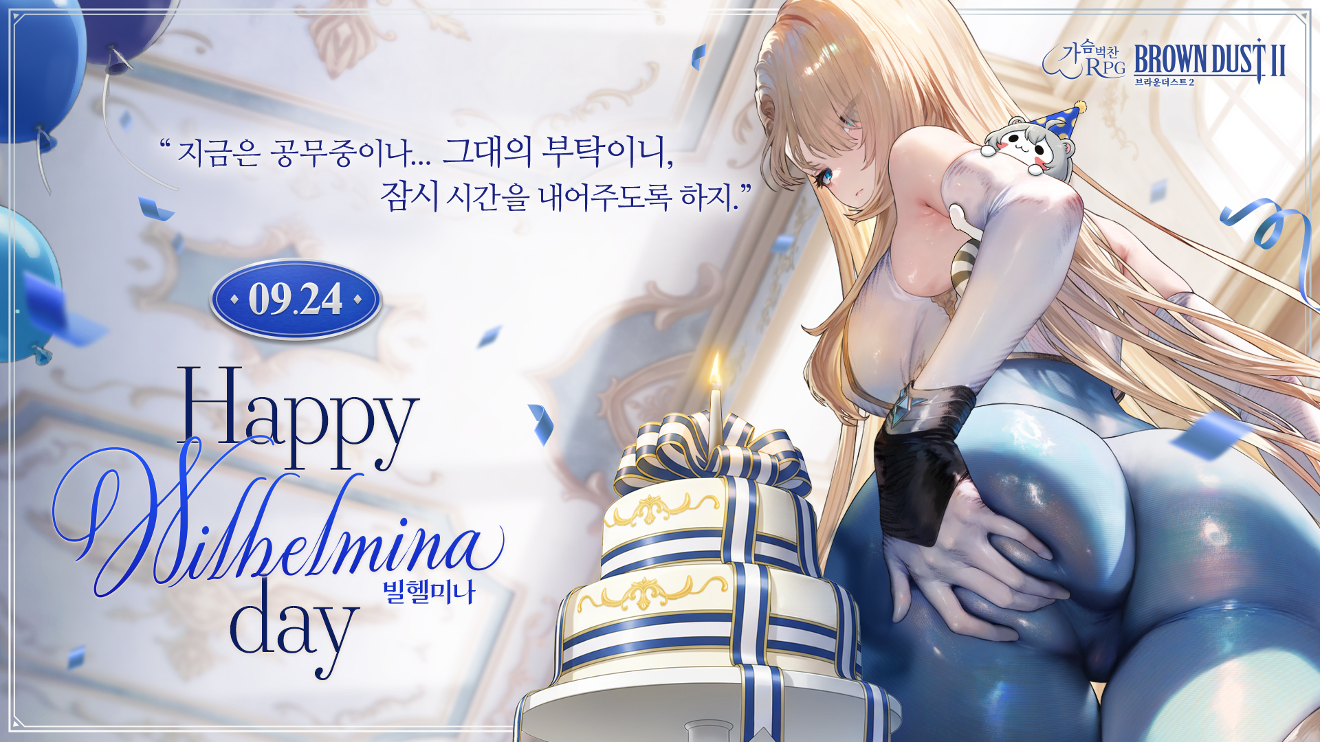2girlsassbackbare shouldersblonde hairblue eyesblue pantsbreastscakecopyright nameelbow glovesenglish textfoodglovesgrabbing own asskorean textlarge breastslong hairmultiple girlspantswhite gloves