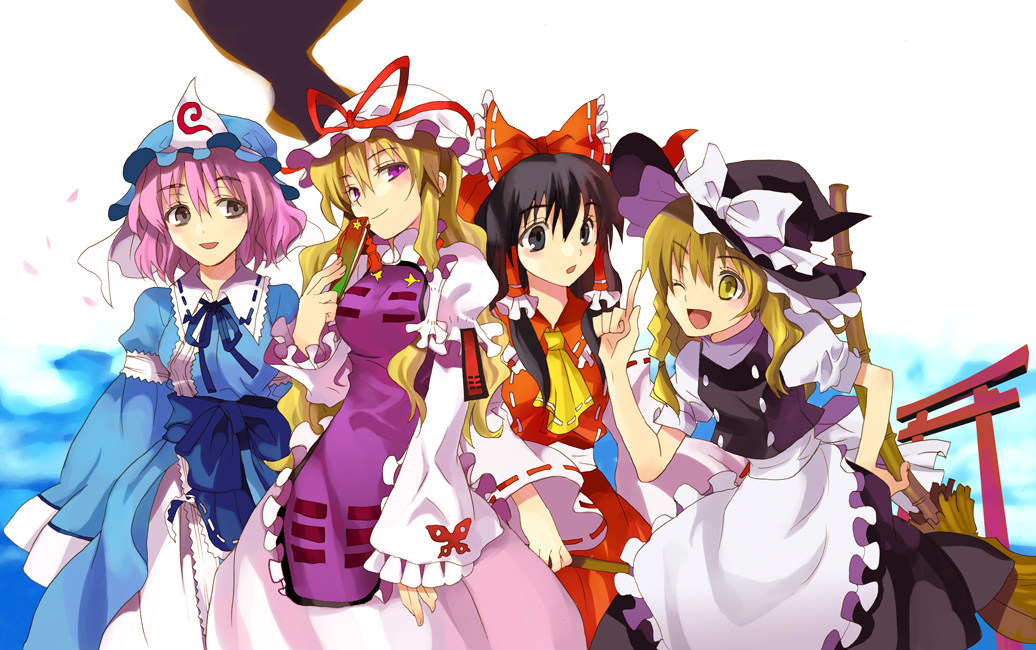 cui ying, alice margatroid, kirisame marisa, touhou, chinese commentary, commentary request, 2girls, black hat, blonde hair, blush, bow, closed eyes, closed mouth, flower, frilled hat, frills, grin, hat, hat bow, heads together, holding hands, interlocked fingers, long hair, multiple girls, purple bow, purple flower, simple background, smile, white background, witch hat, yellow eyes, yuri