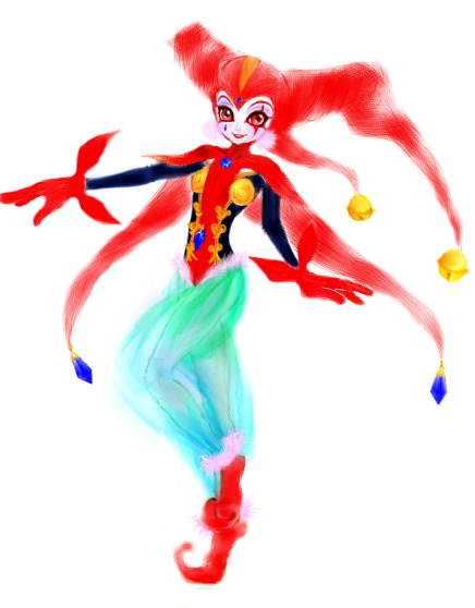 1girlblushbodysuitfacepaintfemale focusfull bodyharlequinhatjesterjester capleotardlooking at viewermakeuppantspom pom (clothes)red eyesred leotardsee-through clothessimple backgroundsolostandingtasseltattooteardrop tattoowhite background