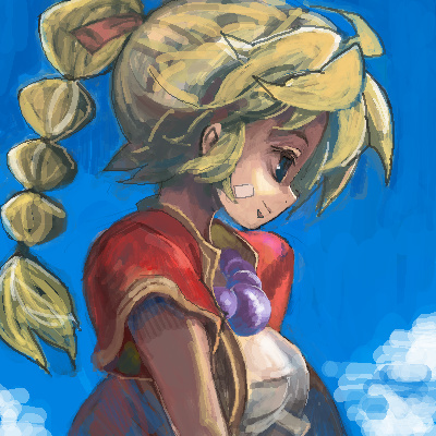 1girlblonde hairblue skyblushbraidbrown eyesclouddayfemale focusfrom sidehigh ponytailjewelrylong hairmulti-tied hairnecklacepearl necklaceponytailshort sleevessingle braidskysolovery long hair