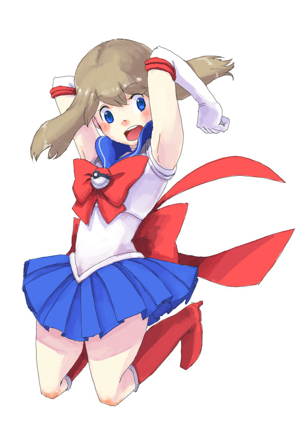 1girlalternate costumeblue eyesblue sailor collarblue skirtblushbootsbowbrown haircosplayelbow glovesfemale focusfull bodyglovesjumpingknee bootsmagical girlno headwearparodyred bowribbonsailor collarsailor moon (cosplay)simple backgroundskirtsolotsukino usagi (cosplay)white backgroundwhite gloves