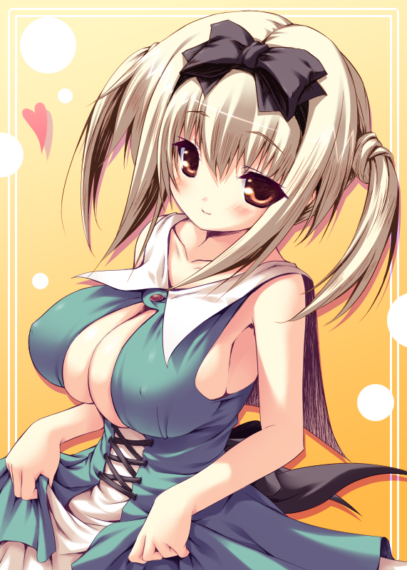 1girlblonde hairblushbowbreastsbrown haircleavagecovered erect nipplesdressfemale focushair bowhair ornamenthearthuge breastslarge breastsorange eyesribbonshort hairsmilesolotwintails