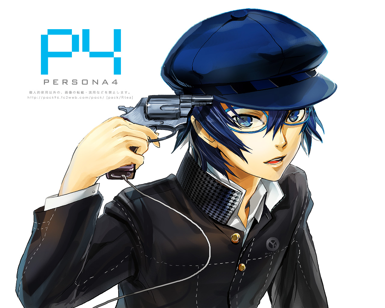 1girlandrogynousblue eyesblue hairevokerfemale focusglassesgungun to headhandgunhatholdingholding gunholding weaponhoundstoothmatching hair/eyesnewsboy capparodypistolreverse traprevolverschool uniformserafukushort hairsoloweapon