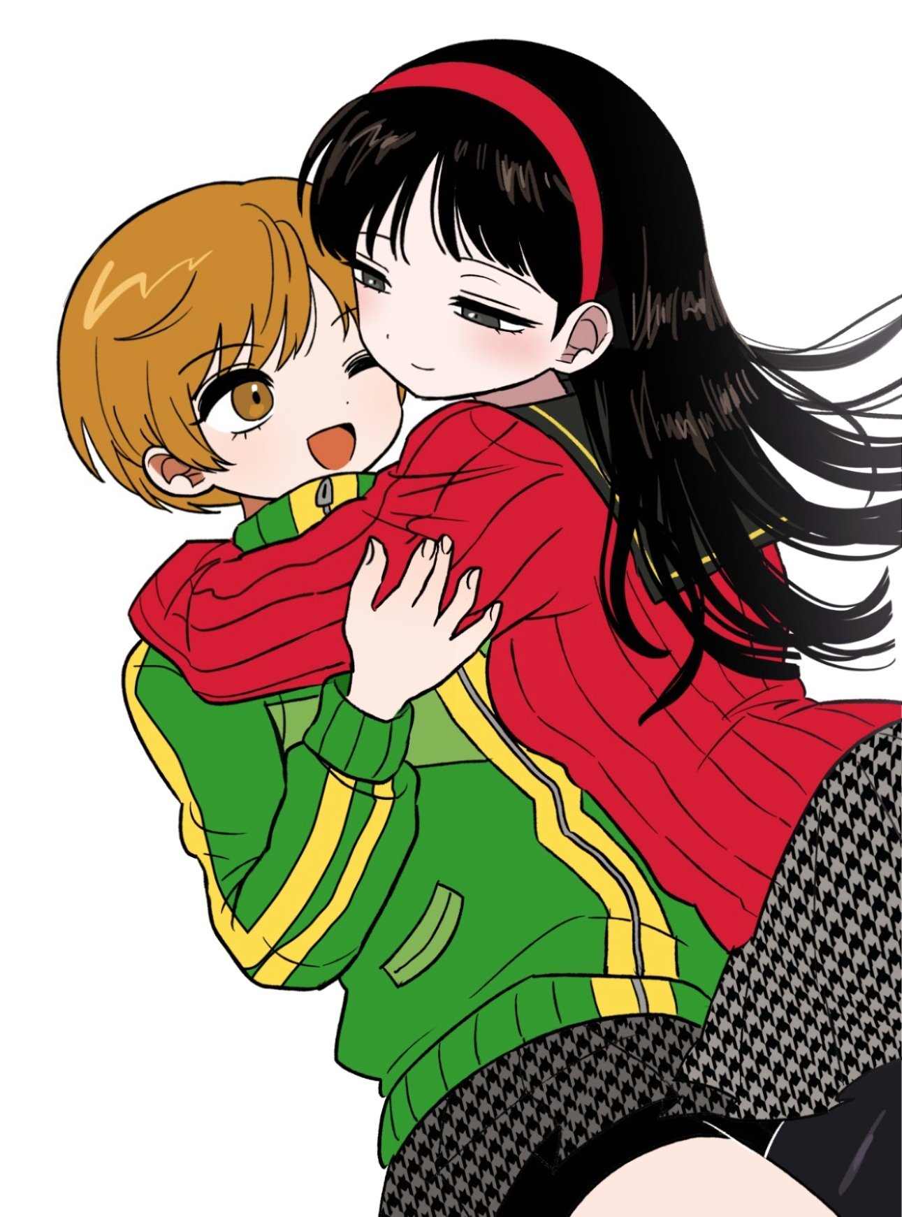 2girlsbike shortsbike shorts under skirtblack eyesblack hairblack sailor collarblushbrown eyesbrown hairgreen jackethairbandhoundstoothhugjacketlong hairlong sleevesmultiple girlsone eye closedopen mouthqnfrjswjsrmflared hairbandsailor collarshort hairsimple backgroundskirtsmiletrack jacketwhite background