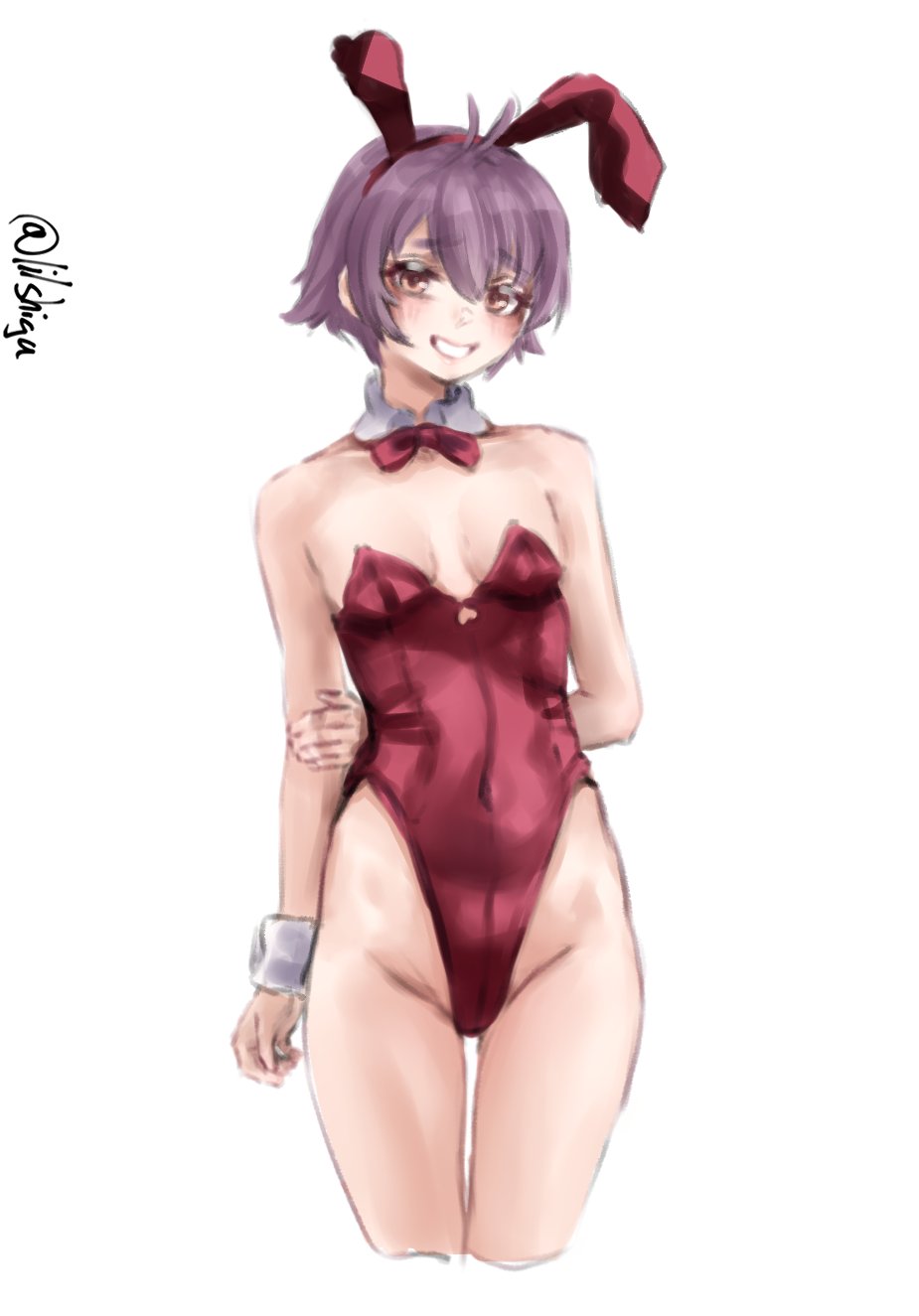 1girlanimal ear hairbandanimal earsbowbowtiebreastsbrown eyescowboy shotdetached collarfake animal earsgrey hairgrinhairbandhighleghighleg leotardleotardone-hour drawing challengeplayboy bunnyrabbit earsred bowred bowtiered leotardshort hairsimple backgroundsmall breastssmilesolostraplessstrapless leotardthigh gapwhite backgroundwrist cuffs