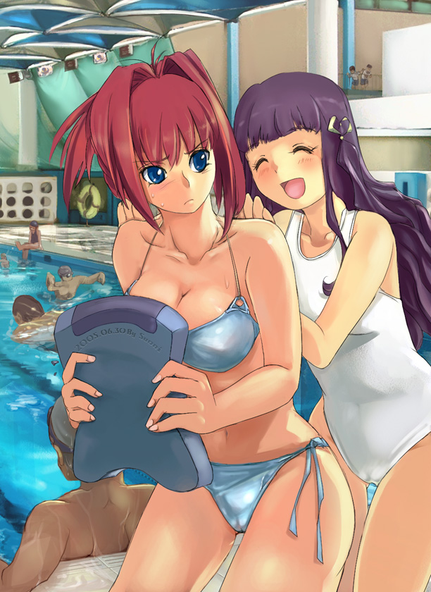 2girlsbikiniblue eyesbreastscameltoeclosed eyeshappylarge breastslong hairmultiple girlsone-piece swimsuitpoolpurple hairred hairshort hairside-tie bikini bottomswimsuitwhite one-piece swimsuit