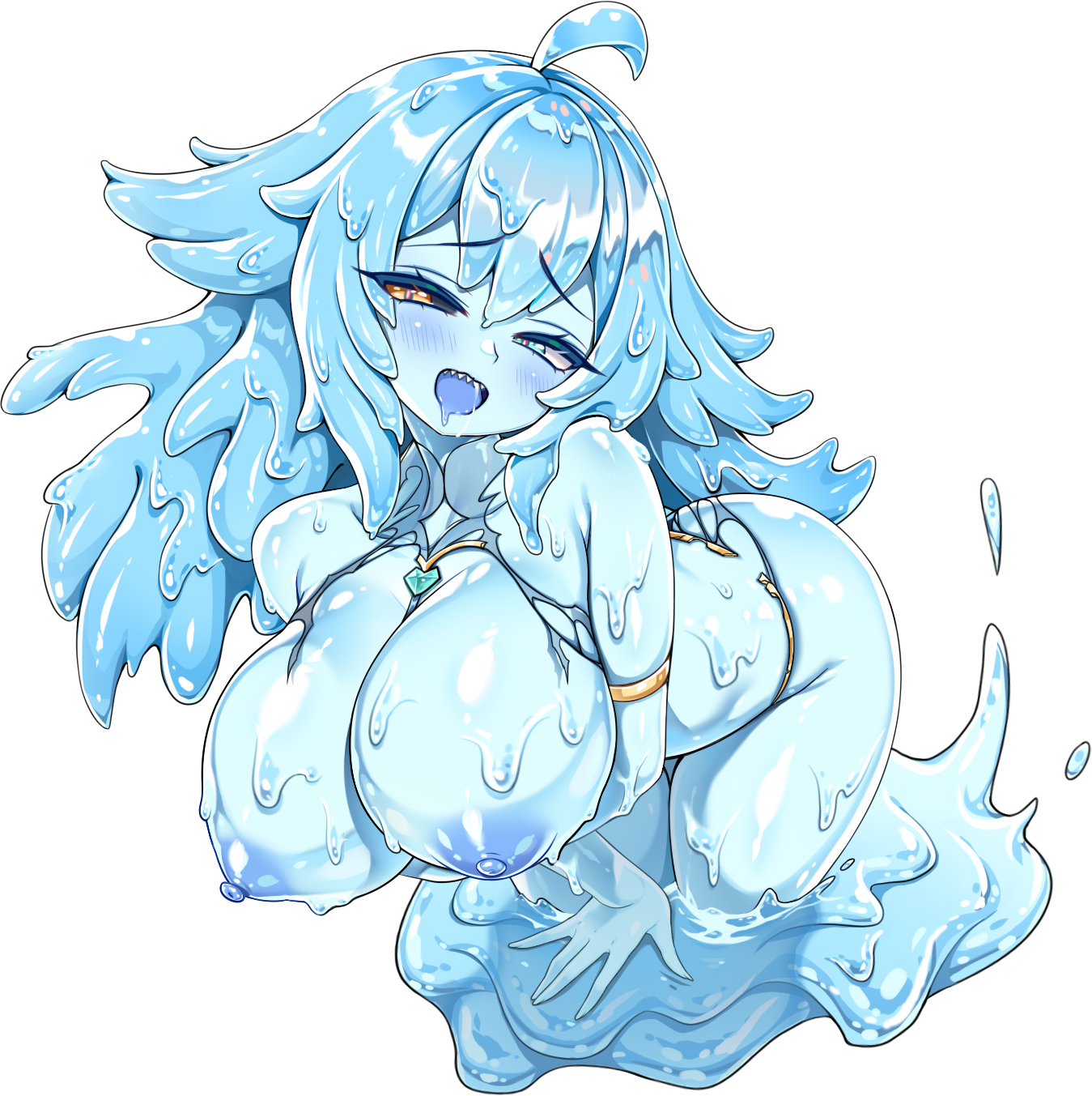 :d1girlarmletassbare shouldersblue eyesblue hairbreastsbrown eyescollarbonecolored skinjewelrylarge breastslong hairlooking at viewermonster girlno braopen mouthplumpsimple backgroundslime girlsmilesolostandingtoracreativesvery long hairwater