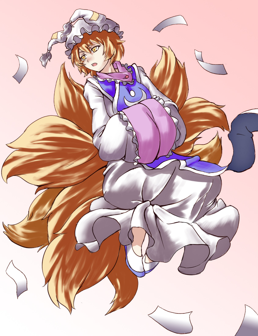 1girlanimal earsanimal hatblonde hairfemale focusfox earsfox tailfull bodygradient backgroundhands in opposite sleeveshatlong sleevesmob capshoesshort hairsittingsolotailtasselwhite backgroundwide sleeves
