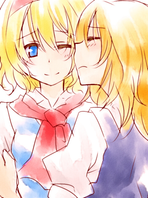 2girlsblonde hairblue eyesblushclose-upclosed eyesfemale focushairbandhugimminent kisslong hairmultiple girlsone eye closedshort hairsmilewinkyuri