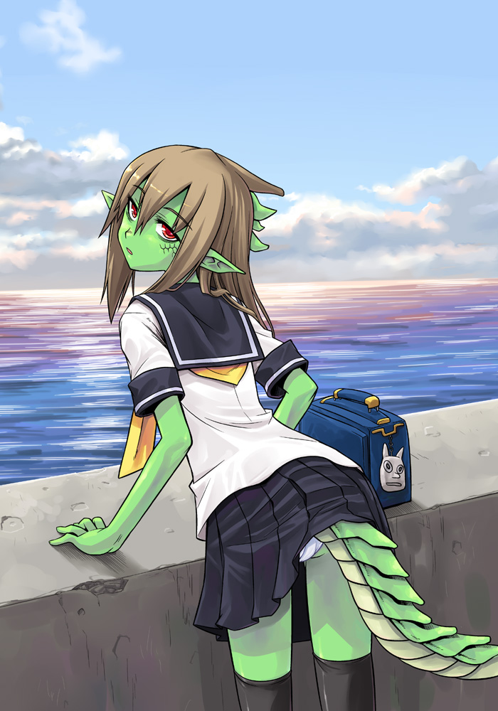 1girlassbrown hairclothes liftcolored skindragon girldragon tailfemale focusgreen skinlifted by taillong hairmonster girlpantiespantyshotpointy earsred eyesscalesschool uniformserafukuskirtskirt liftsolotailthighhighsunderwearupskirtwhite panties