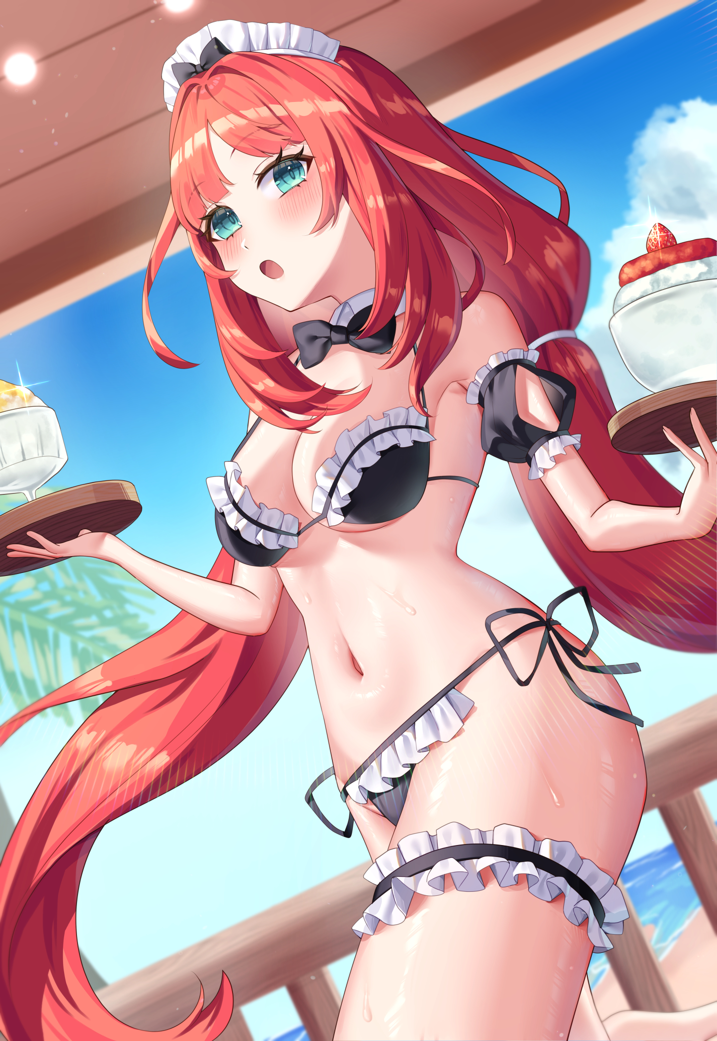 1girlalternate costumeaqua eyesbikiniblack bikiniblack bowblack bowtieblue skyblushbowbowtiebreastscowboy shotdetached collardetached sleevesdutch anglefrilled bikinifrilled thigh strapfrillsholdinglong hairlow twintailsmaidmaid bikinimaid headdressmedium breastsnavelopen mouthred hairside-tie bikini bottomskysoloswimsuitthigh straptwintailsunconventional maid