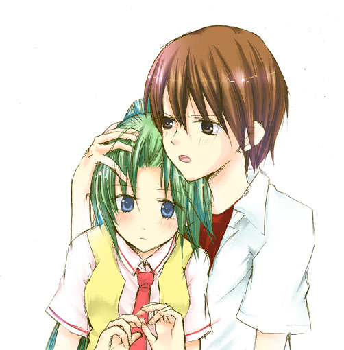 yamaguchi takashi, yamaguchi yuu, hakurei reimu, inubashiri momiji, kochiya sanae, touhou, silver hair, duplicate, 3girls, armpits, blush, breasts, detached sleeves, female focus, green eyes, green hair, hat, japanese clothes, long hair, midriff, miko, multiple girls, navel, pom pom (clothes), purple eyes, purple hair, sideboob, skirt, symmetry, tokin hat