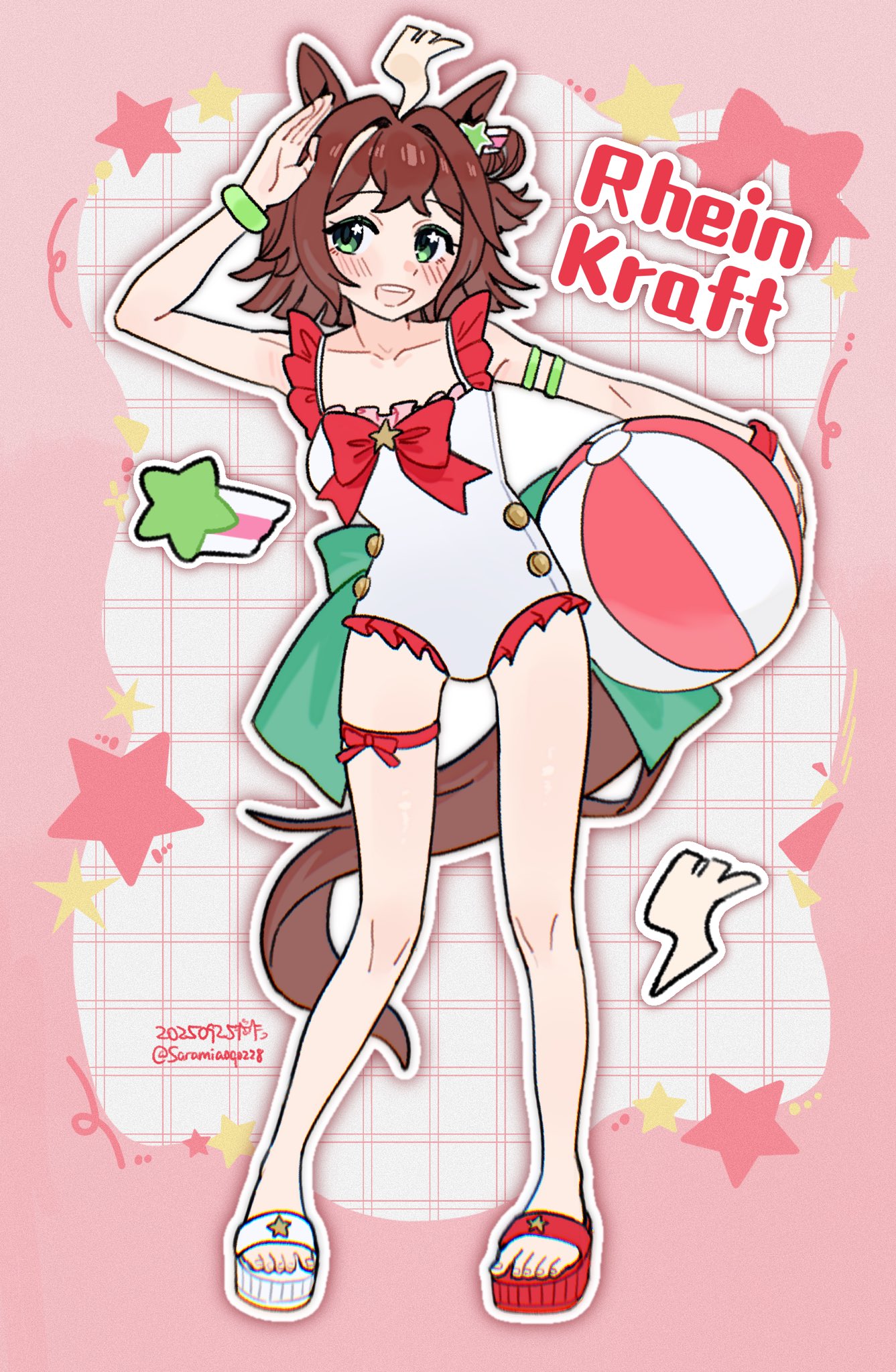 1girlahogealternate costumeanimal earsballblushbreastscharacter namecollarbonedatedgreen eyeshorse earshorse girlhorse tailmedium breastsopen mouthsandalssimple backgroundsoloswimsuittailteethtwitter usernameupper teeth only