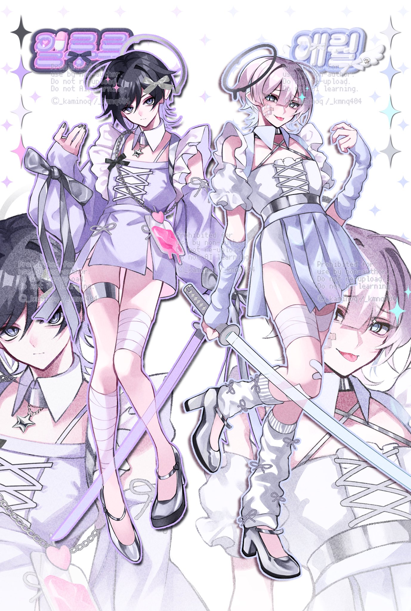 2boysarm warmersbandaged legbandagesblack hairblue eyesblue skirtclosed mouthcrossdressingcrossdressing (mtf)dressfull bodygrey eyesgrey shoeshair between eyeshand uphigh heelslong sleeveslooking at viewermale focusmultiple boyspink hairpleated skirtpurple dressshoesshort hairskirtsmilestandingtonguetongue outwatermark