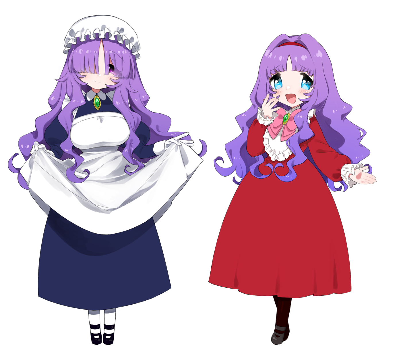 2girlsage comparisonaged downapronapron holdblack shoesblue dressblue eyesblushbowbreastsbroochclosed mouthdressdual personafull bodygemgreen gemstonehair over one eyehatjewelrylarge breastslong hairlong sleeveslooking at viewermaidmaid apronmob capmultiple girlsone eye coveredopen mouthparted bangspink bowpurple eyespurple hairred dressshoessimple backgroundtransparent backgroundwhite apron