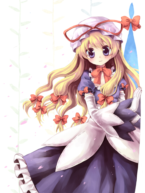 1girlblonde hairfemale focusgap (touhou)hair ribbonhatlong hairpurple eyesribbonsolowhite background