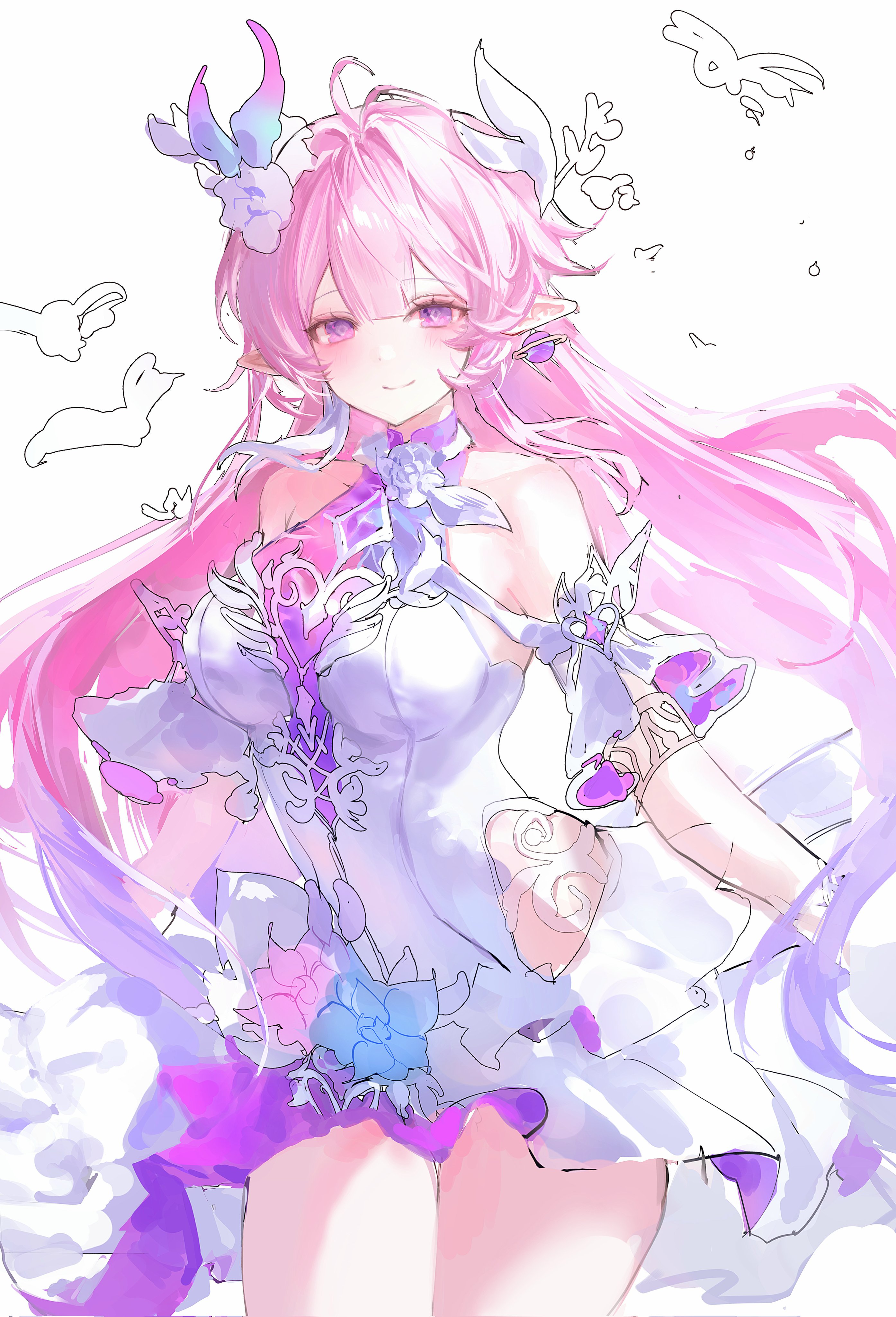 1girl8x9 1tbare shouldersbreastsclothing cutoutcowboy shotdetached sleevesdiamond (shape)diamond-shaped pupilsearringsflowerhair flowerhair ornamentjewelrylarge breastslong hairlooking at viewerpink hairpointy earspurple eyesside cutoutsimple backgroundsmilesolosymbol-shaped pupilsthighsvery long hairwhite background