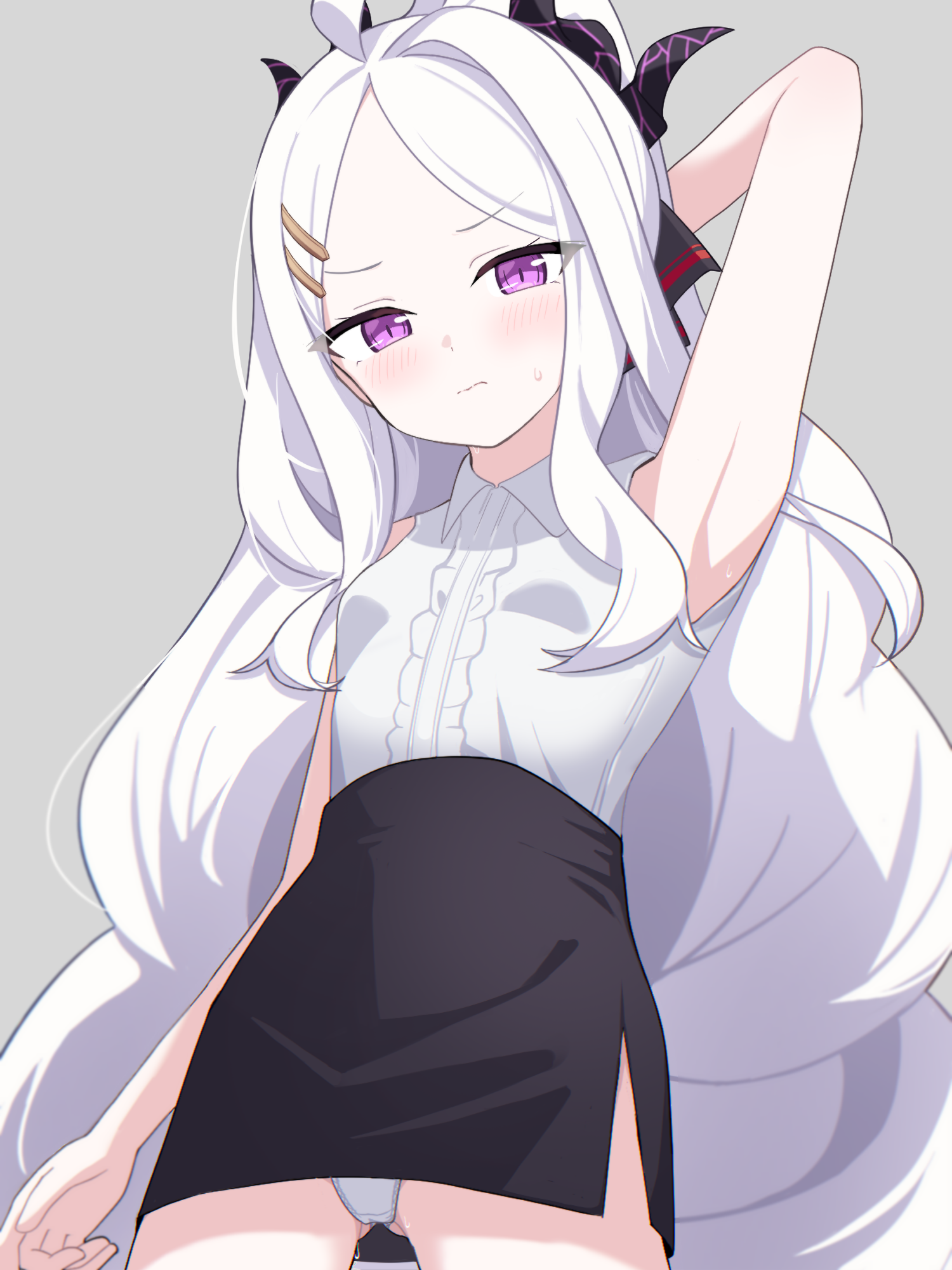 nanoni!, original, absurdres, highres, 1girl, animal ear fluff, animal ears, collar, english text, eyeball, full body, grey hair, grey shorts, open mouth, paw shoes, red collar, red eyes, shaded face, shirt, short hair, short sleeves, shorts, simple background, solo, tail, v-shaped eyebrows, white background, white shirt, wide sleeves, wolf ears, wolf girl, wolf paws, wolf tail
