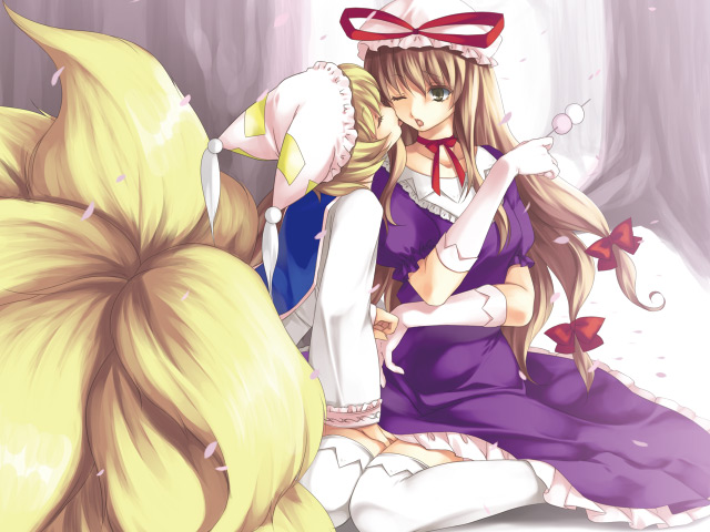 2girlsanimal hatblonde hairbowbrown eyeschokerdangoeatingelbow glovesfemale focusfoodfox tailgloveshair bowhathat ribbonlickinglong hairlong sleevesmob capmultiple girlsmultiple tailsone eye closedpetalsribbonribbon chokersanshoku dangoshort hairshort sleevessittingtailtasselthighhighswagashiwarizawide sleeveswinceyuri