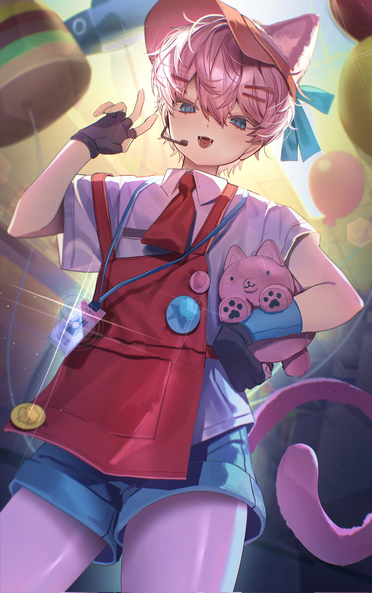 :d1boyanimal earsapronballoonblack glovesblue eyesblue shortscat boycat earscat tailcollared shirtcowboy shotfangsfingerless glovesgloveshair between eyeshand uphatlooking at viewermale focusnecktieopen mouthpink hairred apronred hatred necktieshirtshort hairshort sleevesshortssmilesolotailwhite shirt