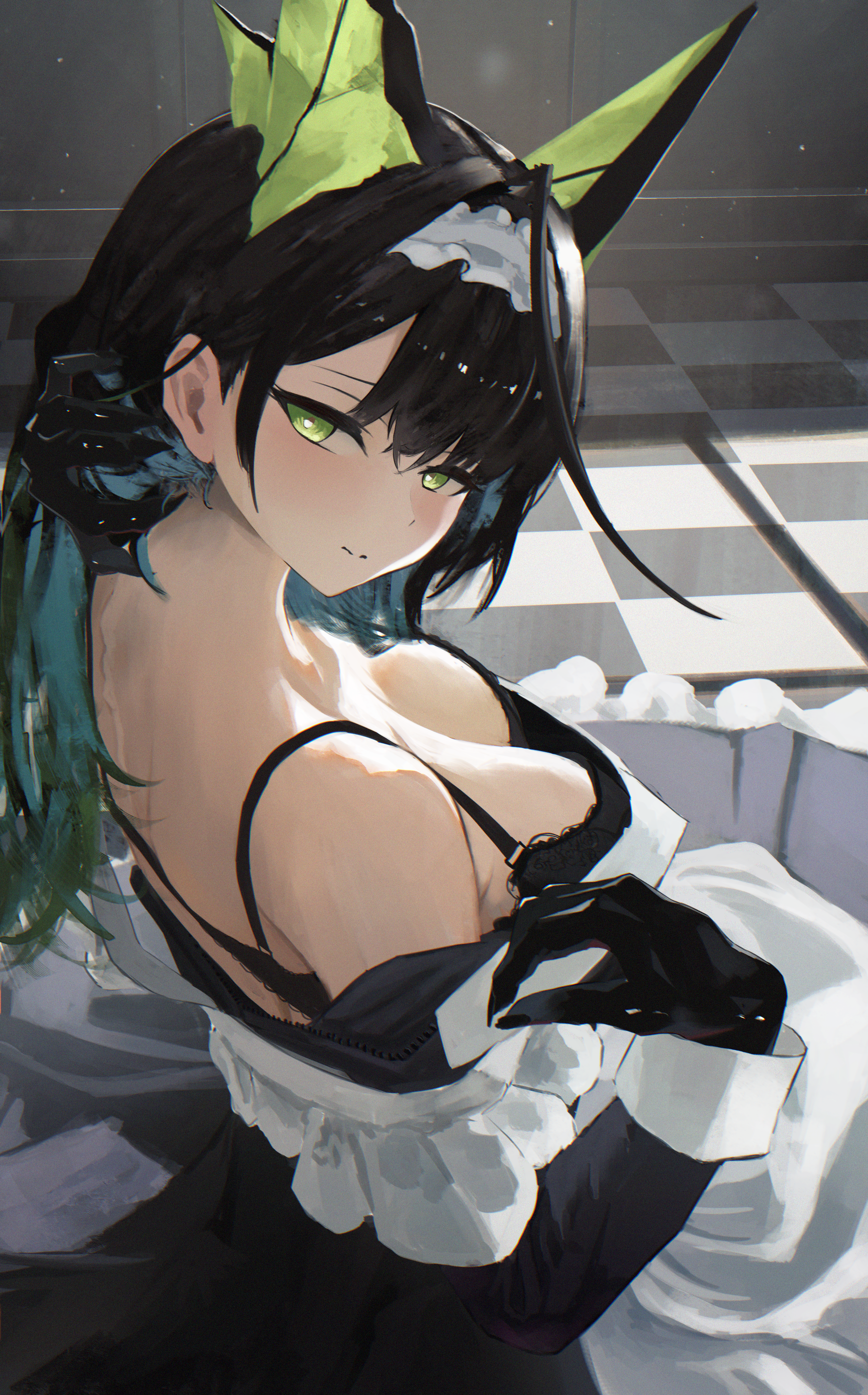 1girlalternate costumeanimal earsapronblack brablack dressblack glovesblack hairbrabreastscat earscheckered floorcleavagedressglovesgreen eyesgreen hairindoorslarge breastslong hairlooking at viewermaidmaid apronsolounderwearwhite apron