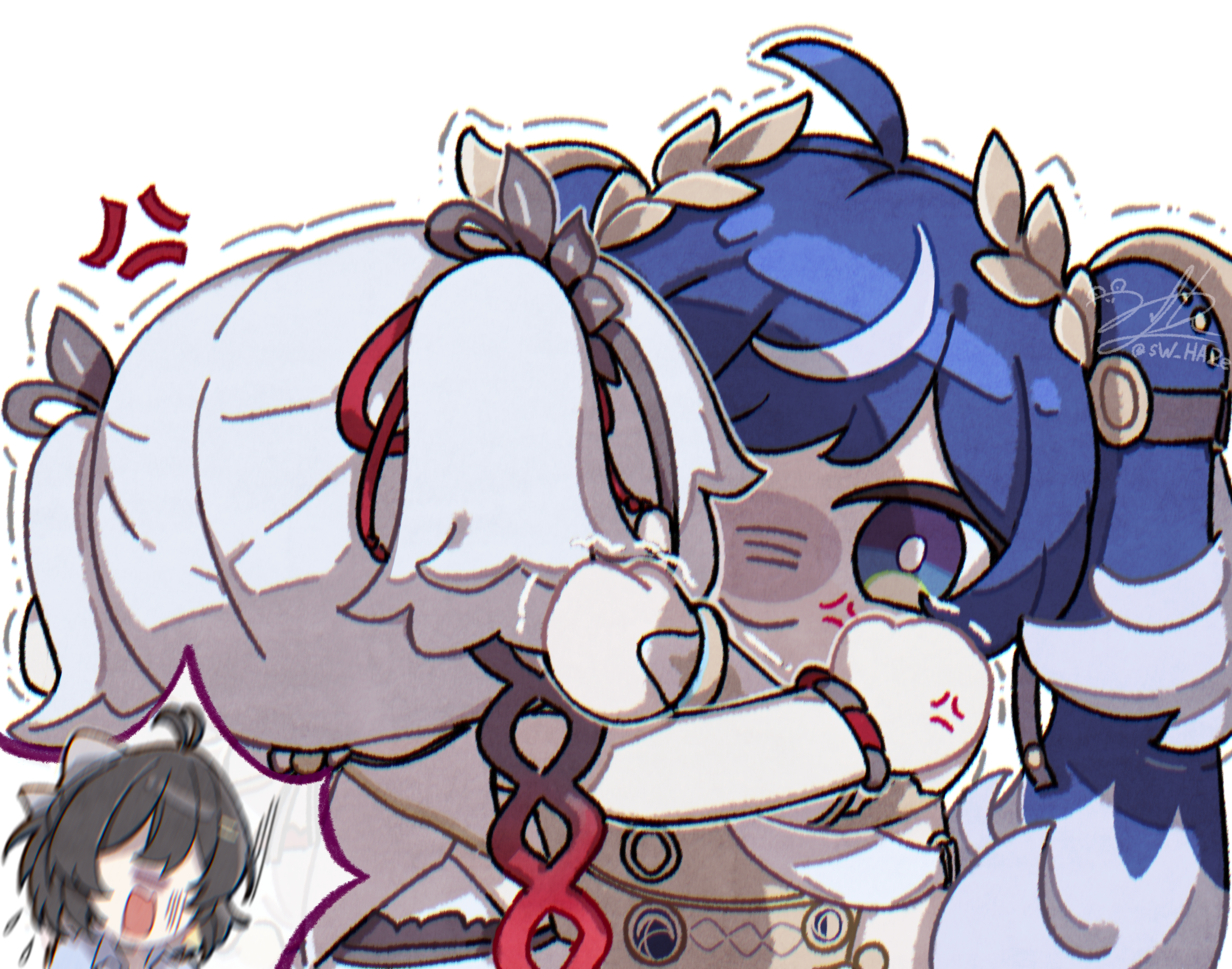 3girlsahogeanger veinblack hairblue eyesblue haircamellya mascot (meme)chromatic aberrationclosed mouthearringshair vinesjewelrylong hairmascot costumemememissing commentarymulticolored hairmultiple girlsopen mouthshort twintailssignaturesimple backgroundsmilestreaked hairtremblingtriangle earringstwintailswhite background