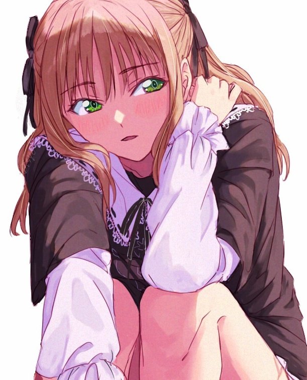 1girlblack dressblushbrown hairdressfrilled dressfrillsgreen eyeslong hairlong sleevesofficial alternate costumeopen mouthsimple backgroundsmilesolowhite background