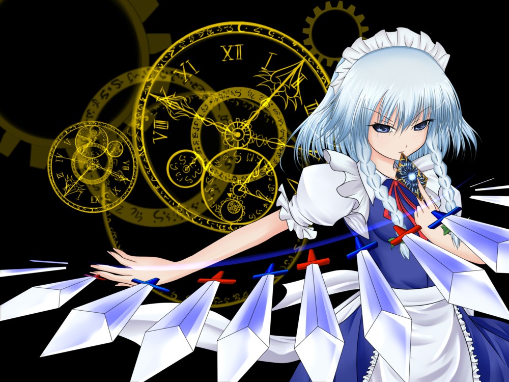 1girlblue eyescardclockfemale focusholdingholding cardknifemaidmouth holdribbonshort hairsolothrowing knifeweapon