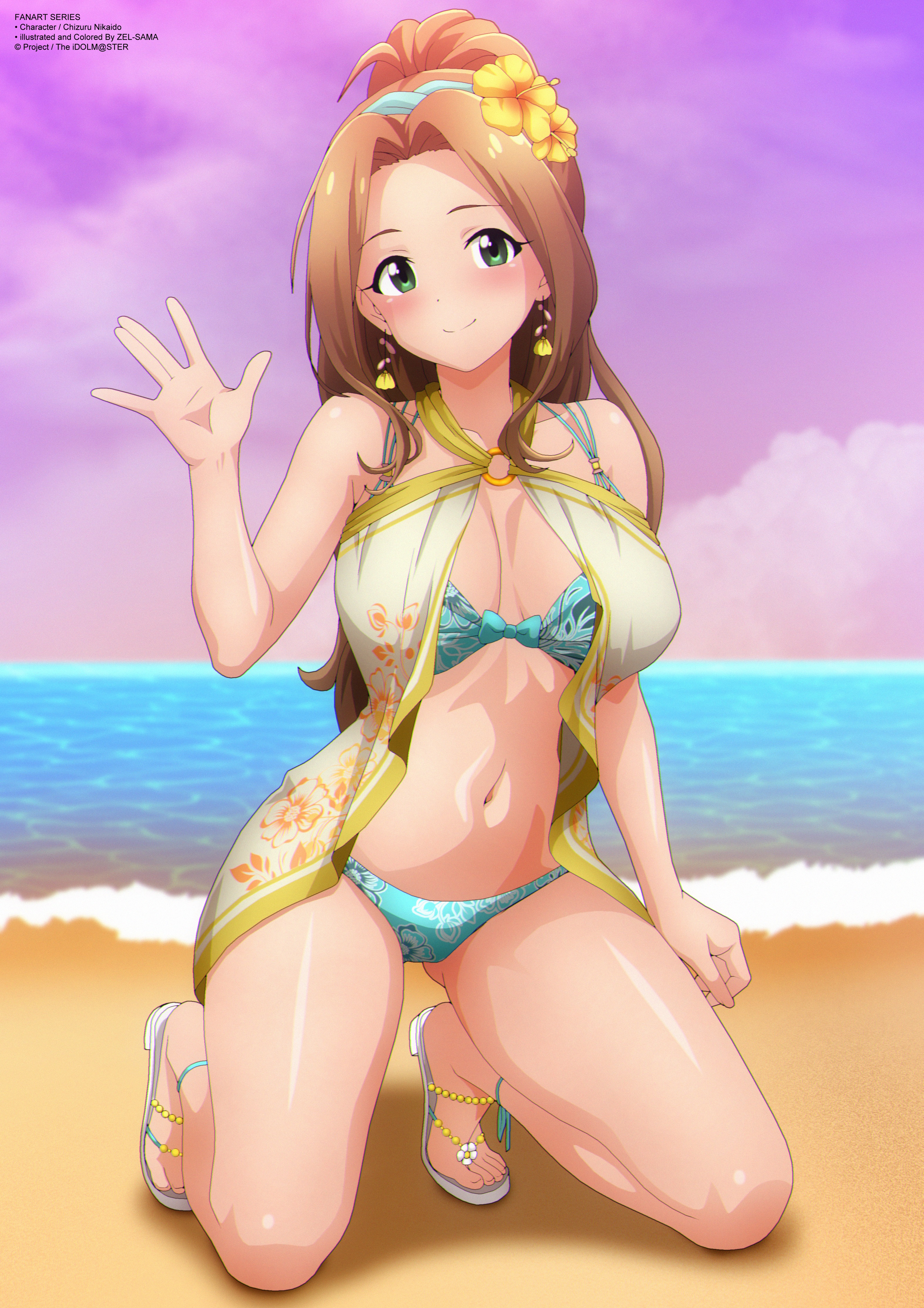 1girlbeachbikiniblue bikiniblue bowblushbowbow bikinibreastsbrown haircloudcollarbonedressearringsflip-flopsfloral printflowergreen eyeshair flowerhair ornamenthairbandjewelrykneelinglarge breastslong hairlooking at viewernavelo-ringo-ring dressoceanopen clothesopen dressponytailprint bikiniprint dresspurple skysandsandalsskysleevelesssleeveless dresssmileswimsuitwaterwavy hairwhite sandalsyellow dressyellow flower