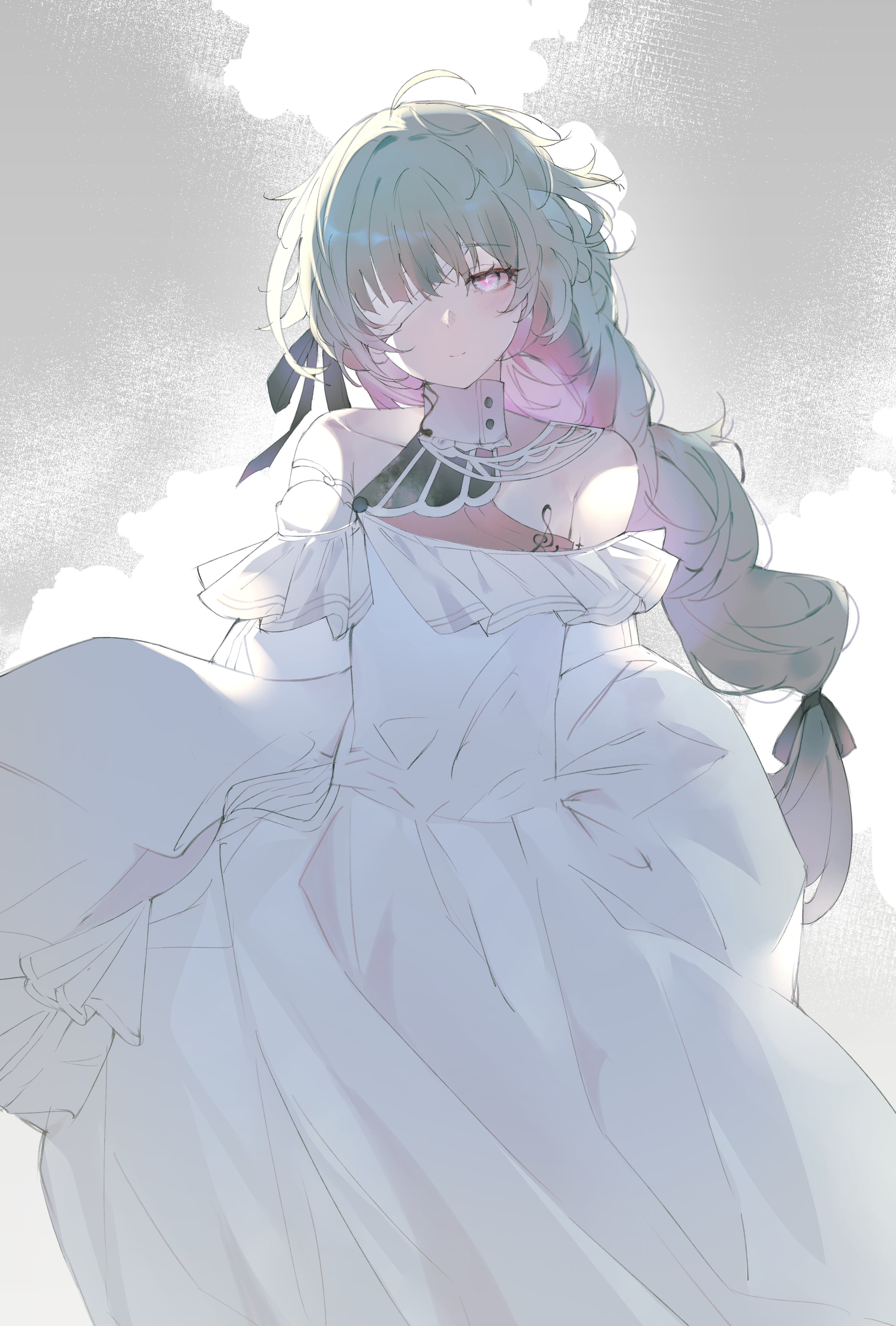 1girlbandage over one eyebare shouldersblack ribbonbraidclosed mouthdressgrey eyesgrey hairhair ribbonlong dresslong hairlooking at viewerlow-braided long hairlow-tied long hairmusical note ornamentofficial alternate costumeribbonsmilesolowhite dress