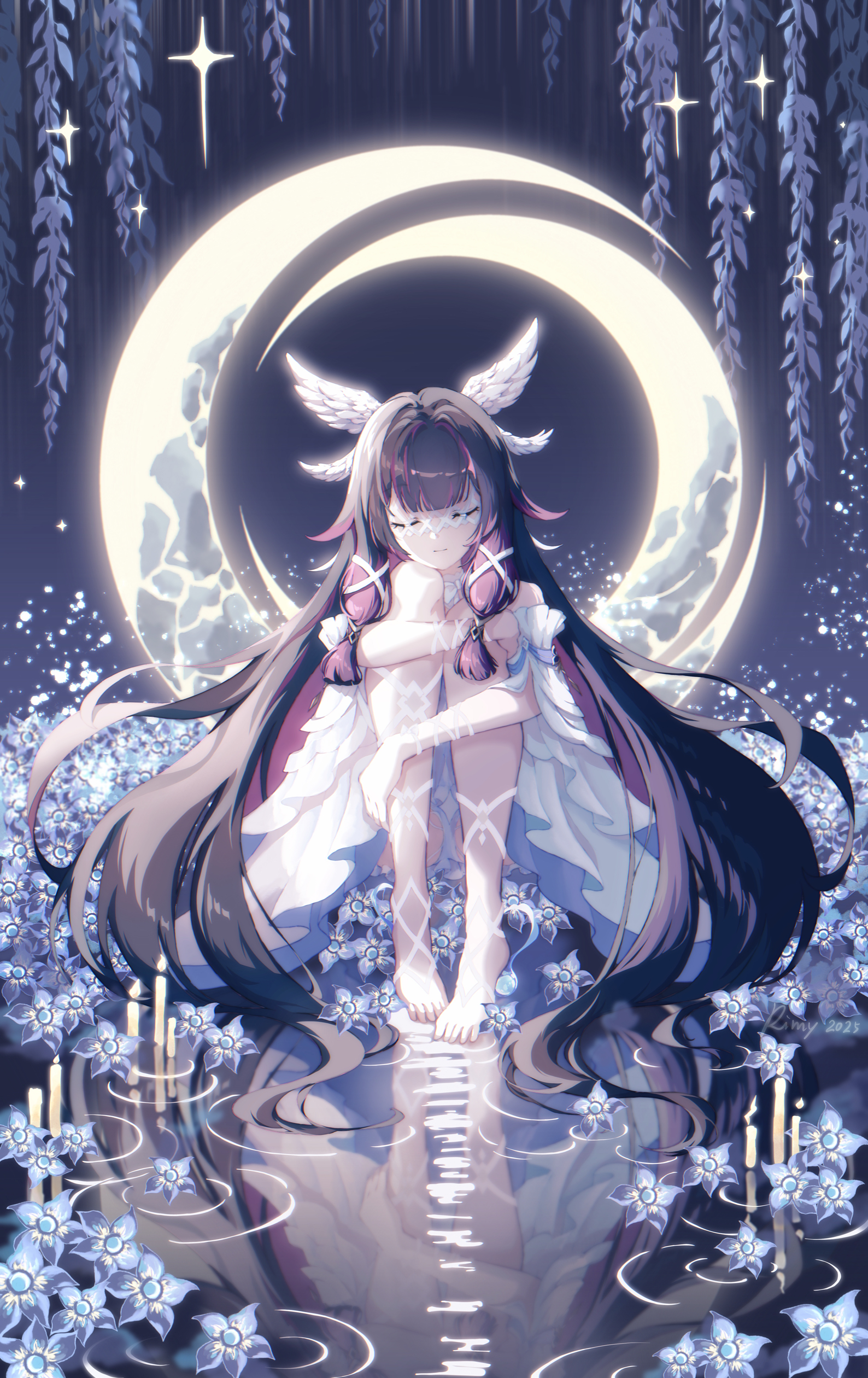 kagari ds, kiss-shot acerola-orion heart-under-blade, kiss-shot acerola-orion heart-under-blade (young), oshino shinobu, kizumonogatari, monogatari (series), absurdres, commentary request, highres, 1girl, arm support, bare shoulders, bird, black ribbon, blonde hair, blurry, blurry background, closed mouth, crow, dress, falling feathers, feathers, film grain, flat chest, from above, light frown, long hair, looking at viewer, looking up, pointy ears, ribbon, shadow, sitting, sleeveless, sleeveless dress, solo, strap slip, sundress, swept bangs, very long hair, white dress, wrist ribbon, yellow eyes