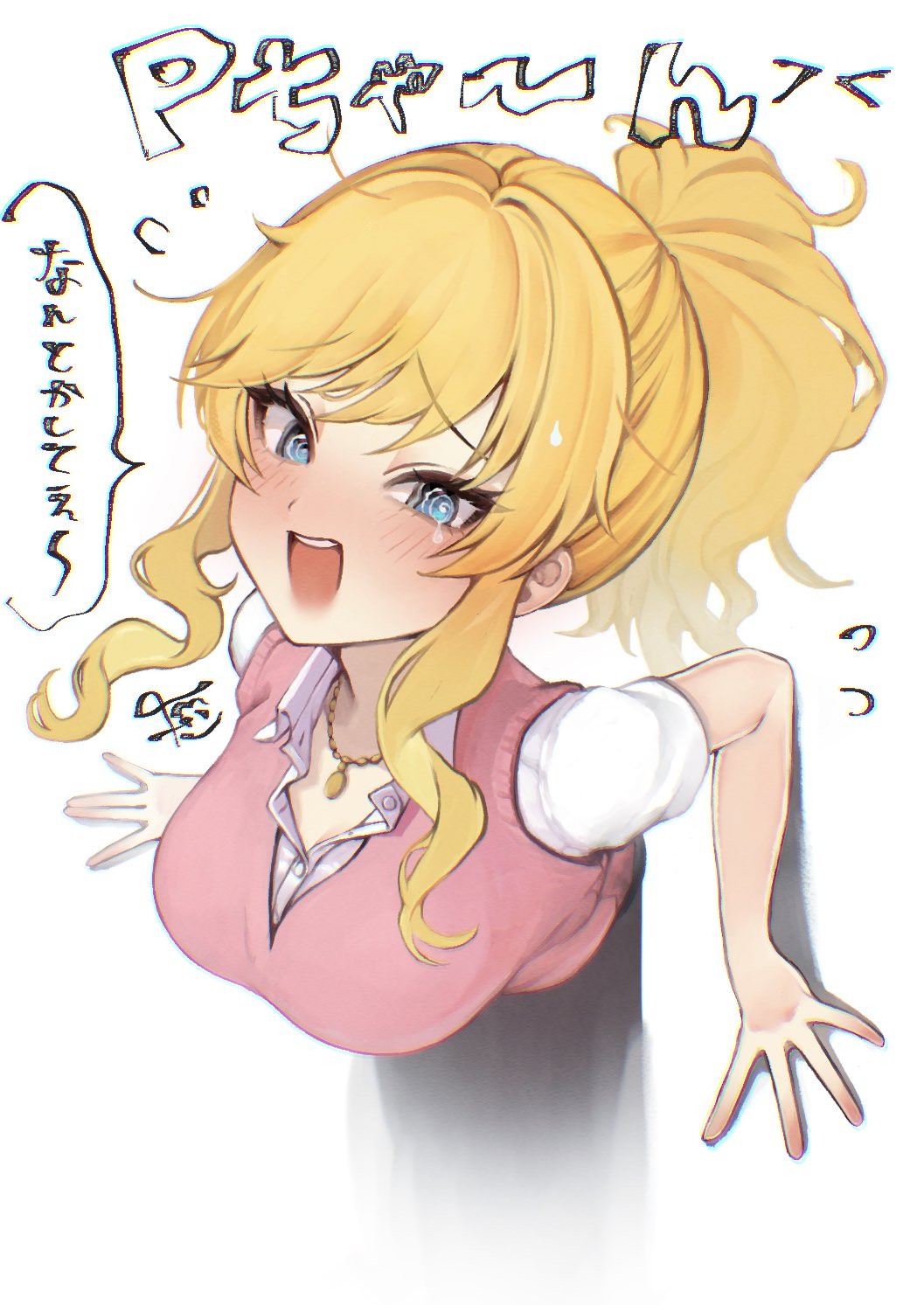:o1boy1girlblonde hairblue eyesblushbreastsflying sweatdropsjewelrymedium breastsnecklacenose blushopen collarpink sweater vestponytailshirtshort sleevessidelockssolospeech bubblesweater vesttearsthrough wallupper bodywhite shirt