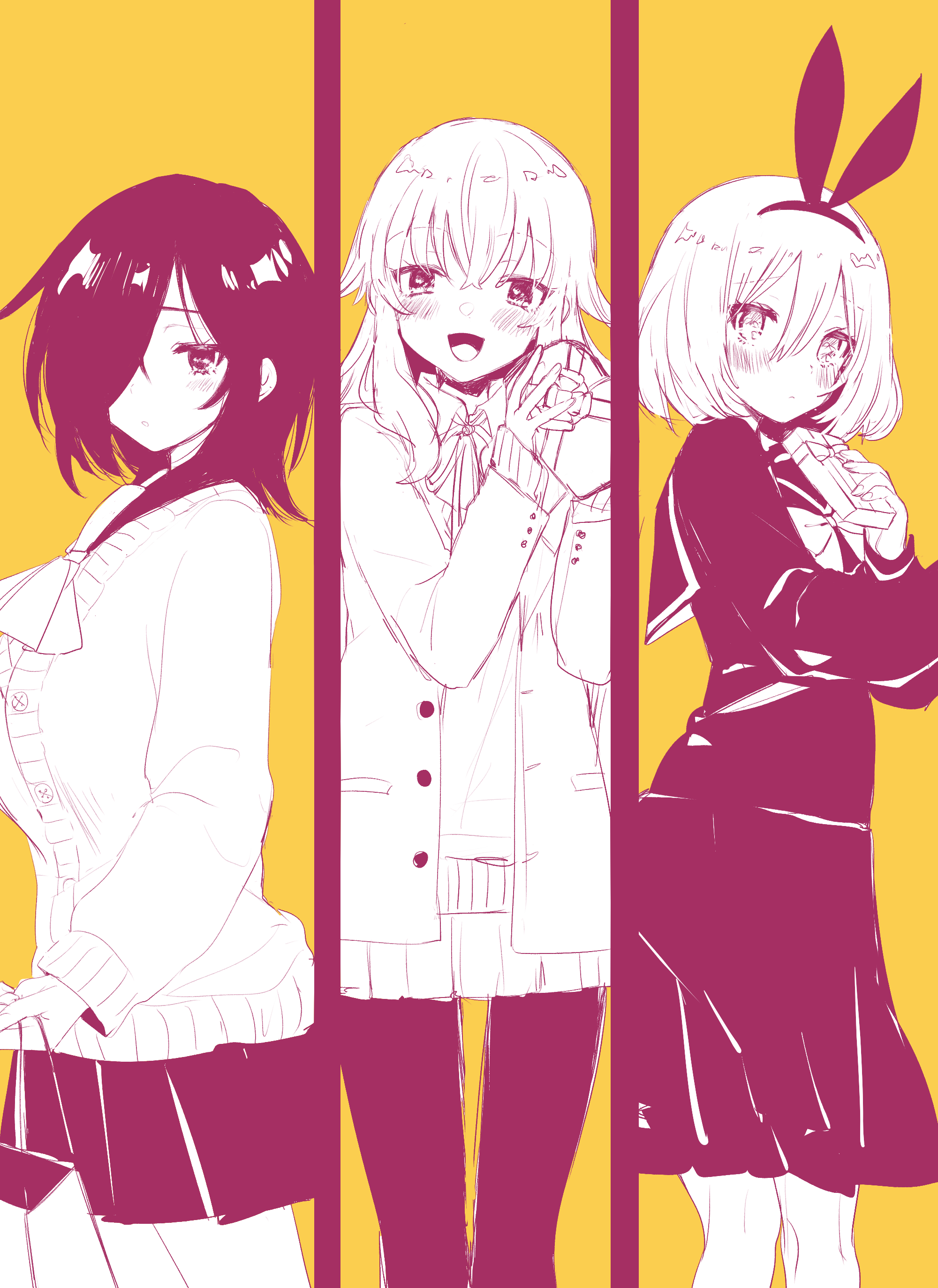 3girlsboxbreastsclosed mouthcoatcowboy shotcrossed bangsdouble-parted bangshair between eyeshair over one eyehairbandholdingholding boxlarge breastslimited palettelong hairlong sleeveslooking at viewermultiple girlsone eye coveredopen mouthpantyhoseparted bangsshirtshort hairsimple backgroundsketchskirtsmilesweateryellow background