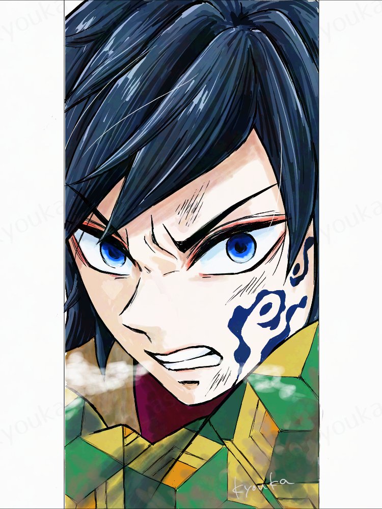 1boyartist nameblack hairblue eyesclenched teethclose-upconstricted pupilsdirtydirty clothesdirty facehaorijapanese clotheskikkoumonkyouka gytnlooking at viewermale focusprint haorired haorisolospiked hairteethupper body