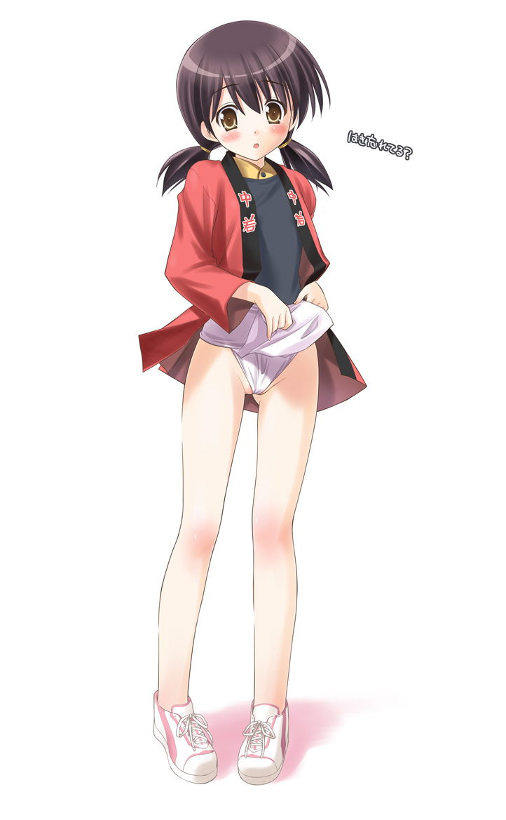 1girlblushbrown eyesbrown haircameltoefemale focusflat chestfundoshihappijapanese clotheslegslolisolotwintailswedgie