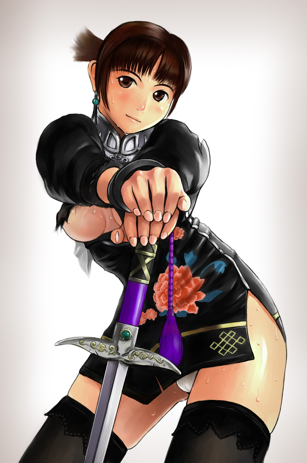 1girlalternate costumeblack thighhighsbreastsbrown eyesbrown hairchina dresschinese clothesdressearringsfemale focusjewelryjian (weapon)large breastslipsno brapantiespantyshotshort hairsolosweatswordthighhighstorn clothesunderwearweaponwetwhite panties