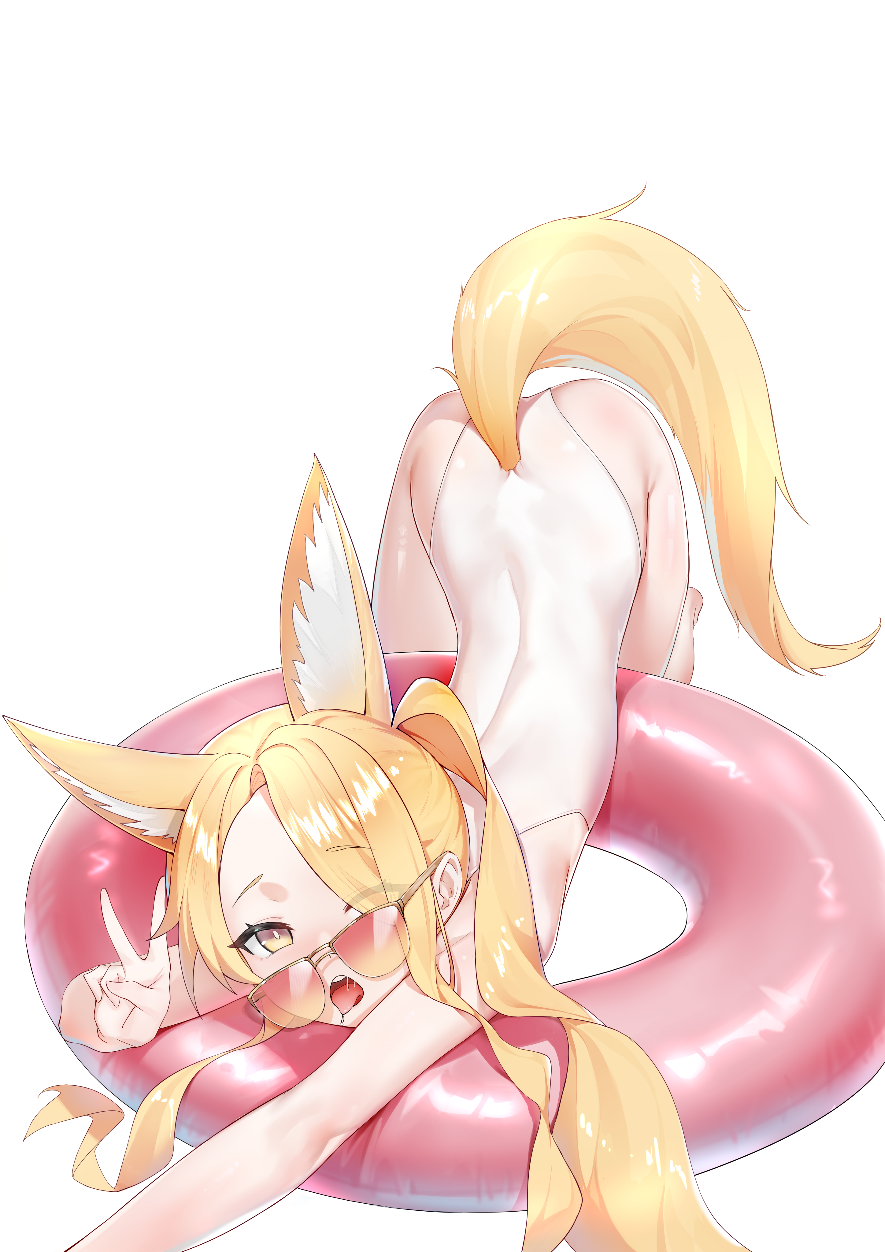 1girlanimal earsblonde hairclothing cutoutfox earsfox girlfox tailhair over one eyehighleghighleg one-piece swimsuitinnertubelong hairlong torsolooking at viewerofficial alternate costumeone-piece swimsuitopen mouthpink innertubered-tinted eyewearside ponytailsimple backgroundsolosunglassesswim ringswimsuittailtail through clothesteethtinted eyeweartonguetongue outtop-down bottom-upupper teeth onlyvwhite backgroundwhite one-piece swimsuit