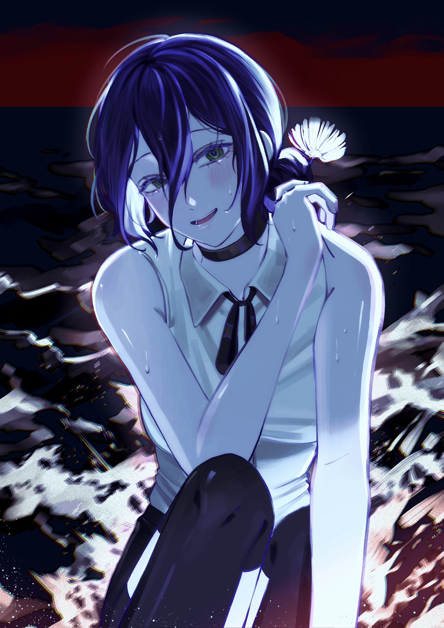 1girlblack bowblack chokerblack shortsblack thighhighsblushbowchokerflowergreen eyeshair between eyesholdingholding flowerknee upopen mouthpurple hairshirtshortssidelockssittingsleevelesssleeveless shirtsmilethighhighswetwhite shirt