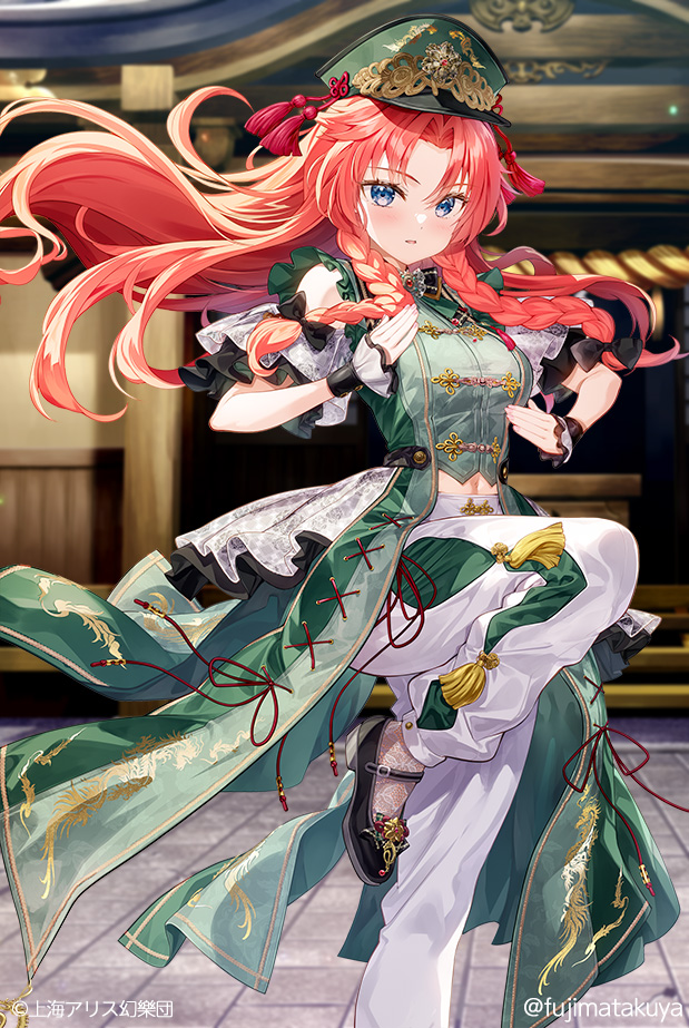 1girlartist nameblack bowblack shoesblue eyesbowbraidchinese clothesdressfighting stancegreen dressgreen hathair bowhatlong hairlooking at viewerpantsred hairshoessolostandingstanding on one legtwin braidswhite pants