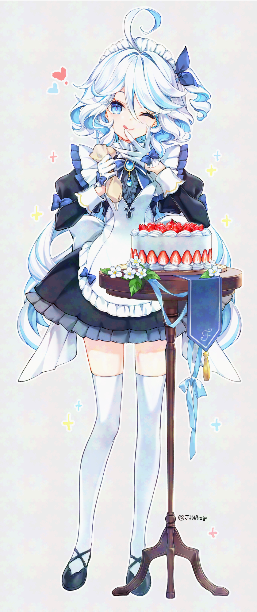 :q1girlahogeapronblack dressblack shoesblue bowblue eyesblue hairblue ribbonbowbroochcakeclosed mouthdressfoodfrilled apronfrillsfruitfull bodyglovesgrey backgroundgrey hairhair ribbonhands upholdingjewelryjuliet sleeveslong hairlong sleeveslooking at viewermaidmulticolored hairone eye closedone side uppastry bagpuffy sleevesribbonshoessmilesolostandingstrawberrytablethighhighstonguetongue outtwitter usernametwo-tone hairvery long hairwhite apronwhite gloveswhite thighhighs